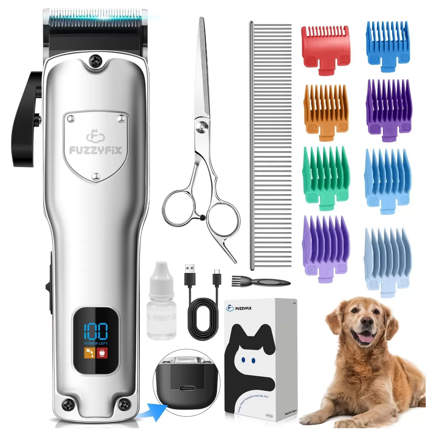 Lo que obtienes: los cortapelos profesionales de peluquería para perros FuzzyFix incluyen todo lo que necesitas, ¡perfecto para principiantes! El paquete contiene 1 cortaúñas para perros, 8 peines guía coloridos (3, 6, 10, 13, 16, 19, 22, 0.984 in), 1 tijeras, 1 peine de acero, 1 aceite de cuchilla, 1 cable USB, 1 cepillo de limpieza.