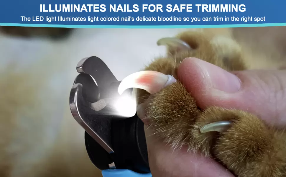 Cortauñas para mascotas con luz LED. Su hoja afilada ilumina la línea de sangre para un corte preciso y sin dolor, ideal para uñas oscuras y gruesas.