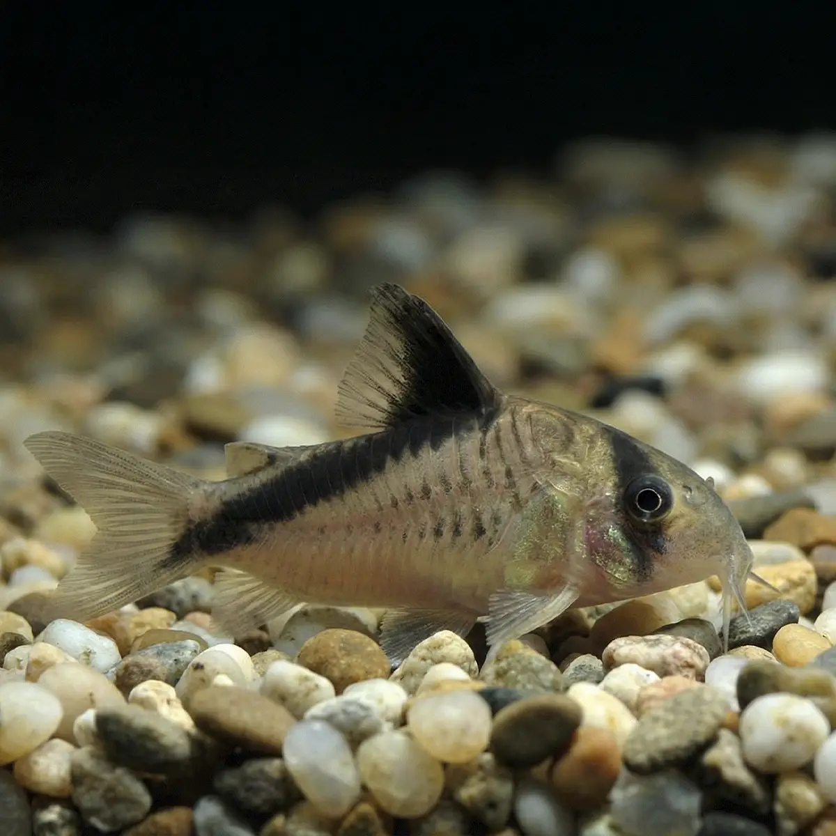 Esta especie destaca por su elegante patrón de coloración, con una línea oscura que recorre su cuerpo diagonalmente, diferenciándose de otras especies similares. Al tratarse de ejemplares salvajes, la Corydora Melini Salvaje aporta un comportamiento muy natural y vivaz al acuario, siendo excelente para mantener limpio el sustrato de restos de comida no consumida por otros peces.