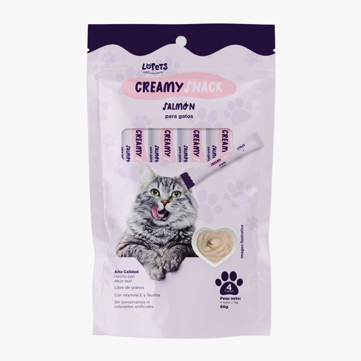 Los Creamy Snacks Lopets tienen alto contenido de humedad, el necesario para la salud de los felinos. Simplemente rasgue un tubo y apriételo un poco para alimentar a su felino con estos snacks sin cereales ni conservantes. El paquete contiene 4 porciones de 15g cada una. Hechos con ingredientes reales libre de granos con vitamina E y taurina sin conservadores sin colorantes artificiales.