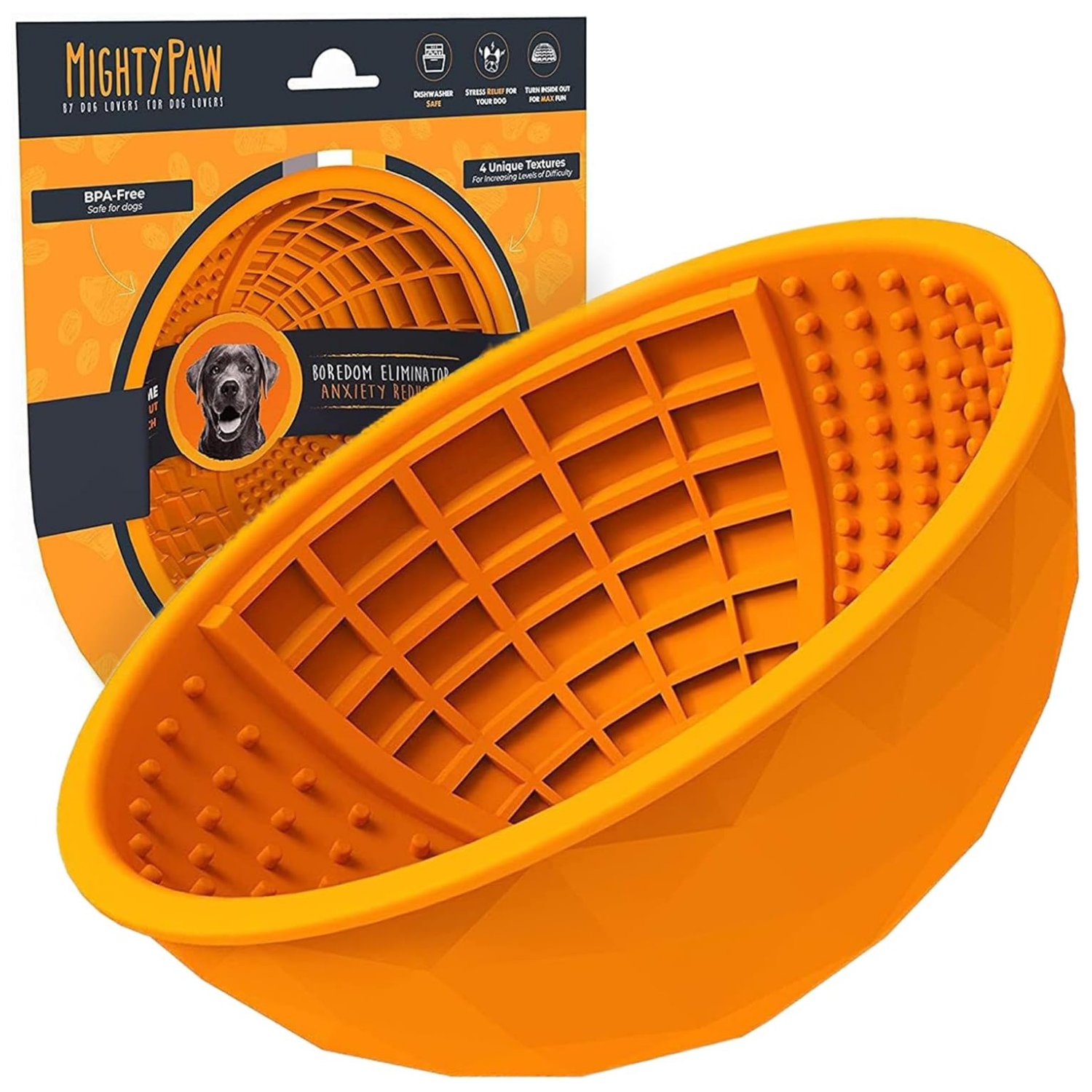Los cuencos de silicona para perros Mighty Paw’s están hechos con silicona 100% libre de BPA, de grado alimenticio que es completamente segura para perros de todos los tamaños para lamer y comer. Puede untar alimentos blandos como mantequilla de maní, yogur, puré de calabaza o requesón en el lado texturizado o usarlo como un tazón de alimentación lenta con la comida húmeda o cruda para perros de su cachorro.