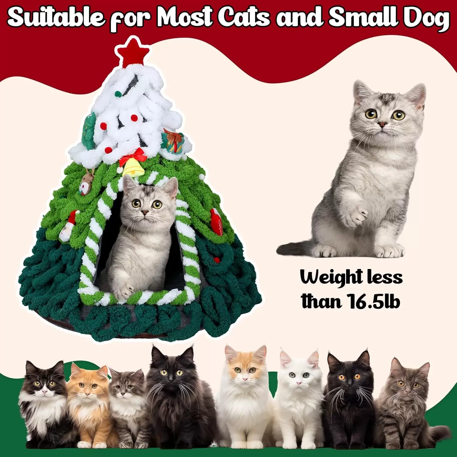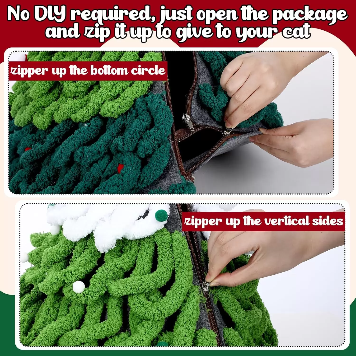 ¡El regalo de Navidad sin complicaciones! Esta Cama Cueva con diseño de Árbol de Navidad viene totalmente montada. Simplemente desempaca y colócala en el lugar deseado; no requiere ensamblaje. Tu gato puede sumergirse directamente en su nuevo refugio con facilidad.