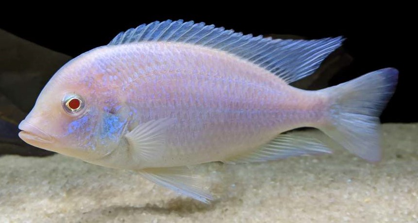 ESTE MALAWI, CONOCIDO POR DELFIN DEL MALAWI POR LA FORMA DE SU CABEZA, ES BASTANTE TRANQUILO, VARIEDAD NUEVA DE COLOR BLANCO A LOS 14 CM.