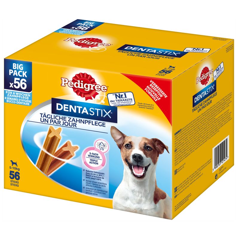 Los snacks dentales para perros Pedigree Dentastix son unas deliciosas golosinas con forma de palito estriado con múltiples beneficios para tu mascota. Actúan como un cepillo de dientes, limpiando y eliminando la suciedad de su boca. Estos snacks sirven como premio y, además, tienen un beneficio para la salud bucodental de tu perro.