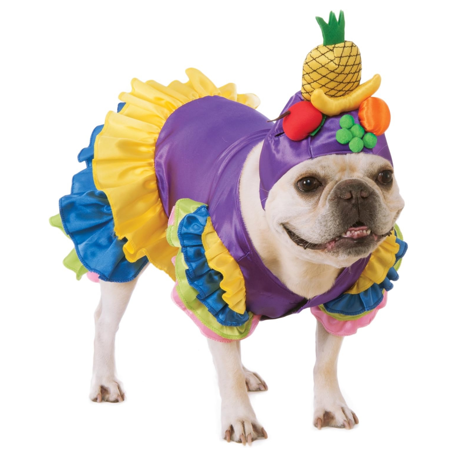 El disfraz para mascotas cuenta con un sombrero de fruta de felpa y un vestido con capas de volantes de colores