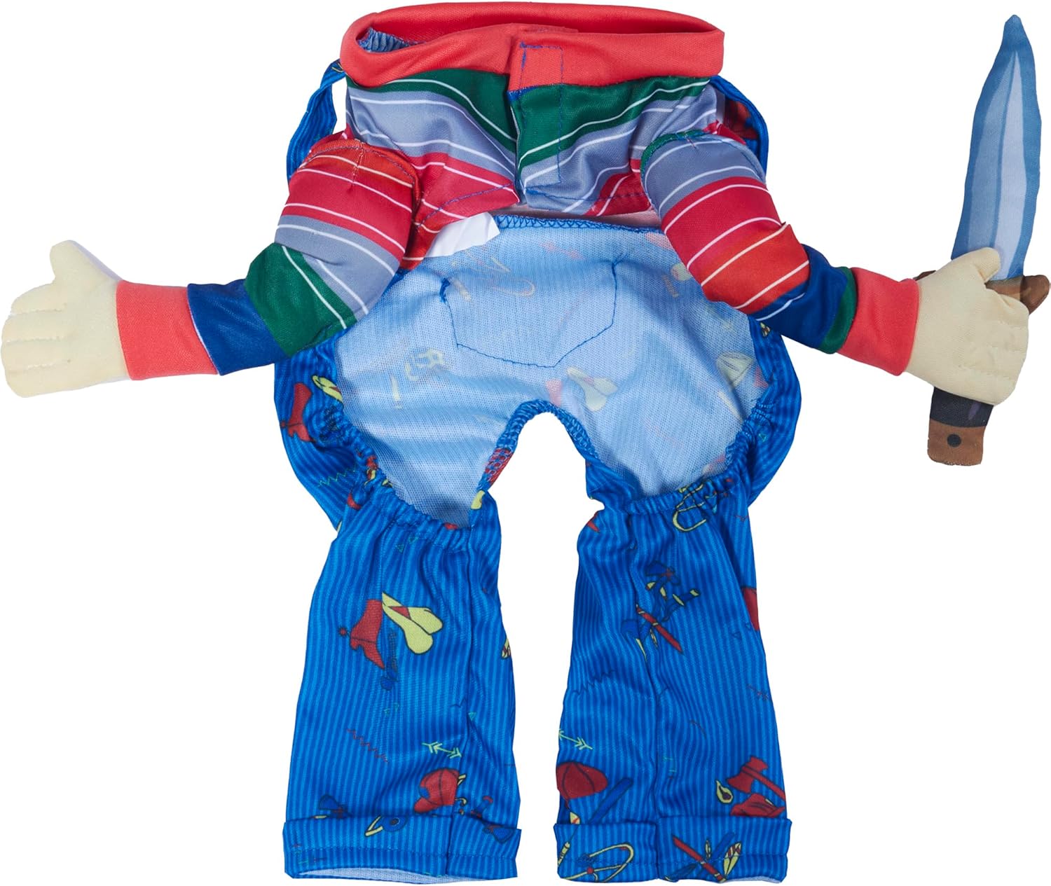 Aspecto divertido y atrevido: el disfraz de mascota con tocado cuenta con brazos falsos para una apariencia llamativa de Chucky caminando, perfecto para fiestas de Halloween y eventos de mascotas.