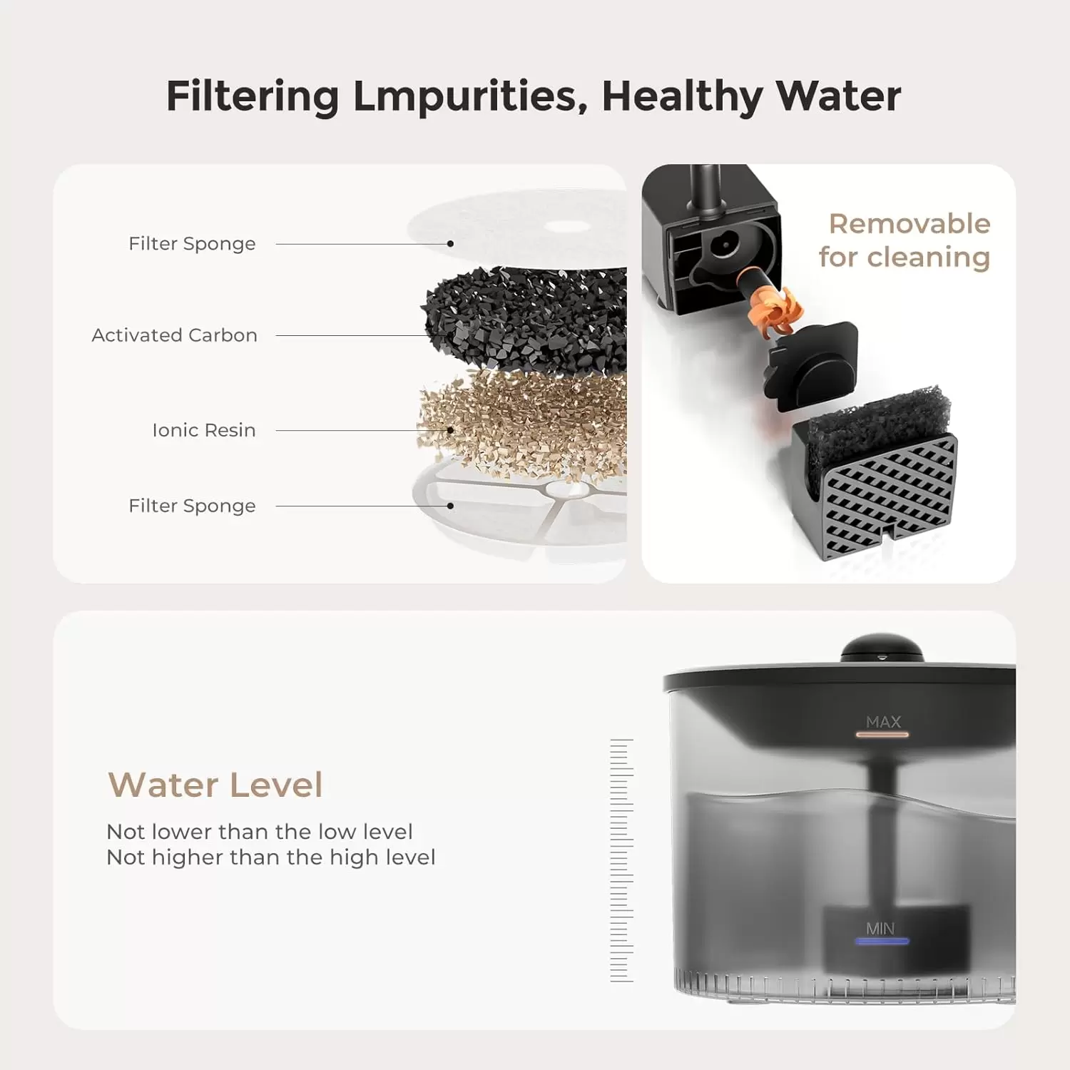 Hidratación superior con sistema silencioso La fuente de 3 litros utiliza una tecnología de filtrado en tres etapas para eliminar pelos y sedimentos, manteniendo el agua fresca por días. Sus dos modos de flujo incentivan a tu mascota a beber más, lo cual es vital para su salud renal. El diseño de todo el kit es desmontable y apto para una limpieza rápida, asegurando que el área de alimentación se mantenga impecable y libre de bacterias.