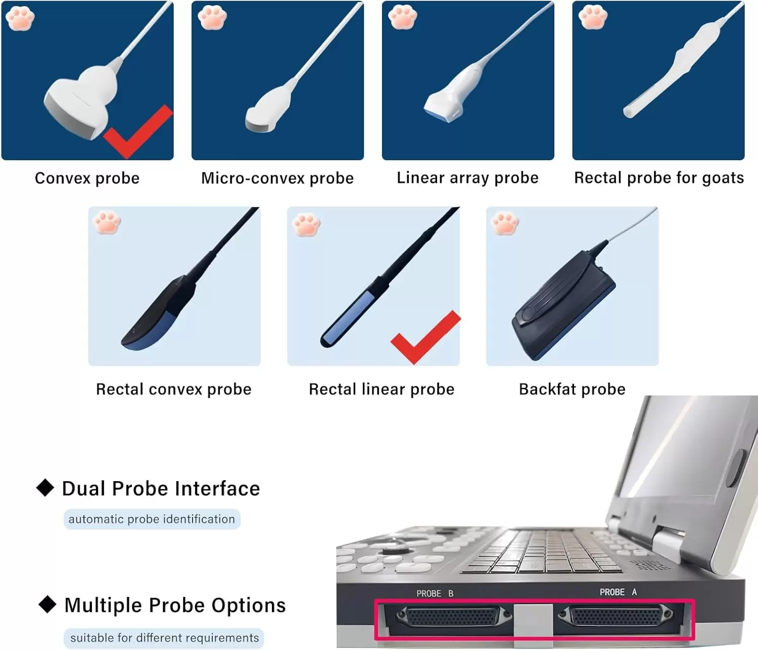 Sonda rectal plana de 6,5 MHz y sonda rectal curva de 3,5 MHz para ganado, vacas, caballos y camellos.