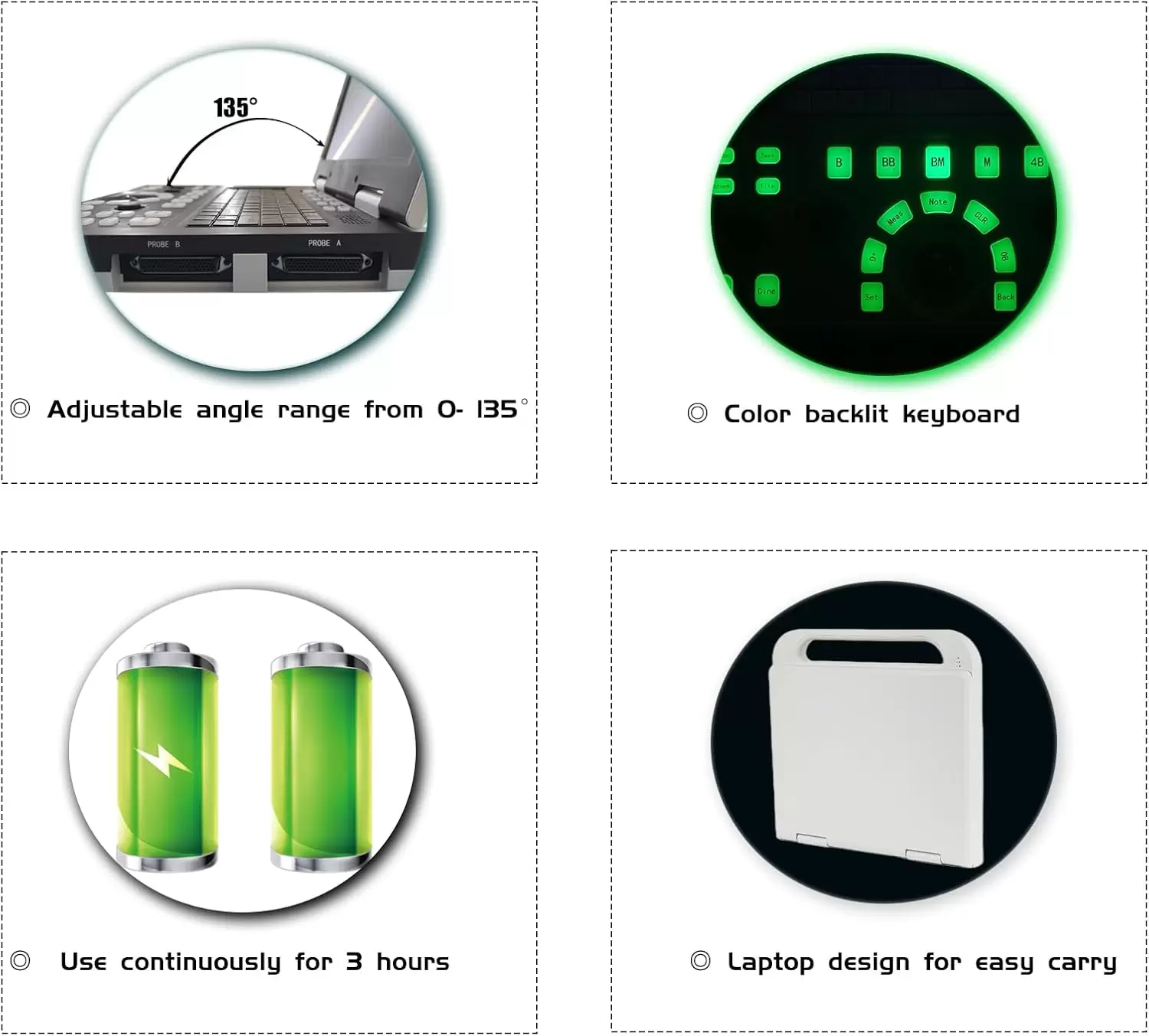Equipado con una potente batería recargable de 6000 mAh para 2.5-3 horas de funcionamiento y un SSD de 128G para un amplio almacenamiento de datos, esta máquina satisface las demandas de entornos de atención médica ocupados sin comprometer el rendimiento
