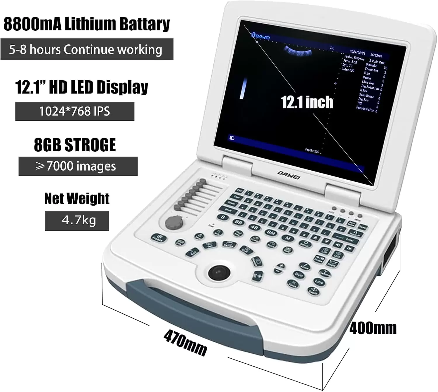Ecógrafo portátil DAWEI MU10 con pantalla HD 12.1 pulgadas. Perfecto para diagnóstico veterinario móvil y de alta resolución. Incluye sonda Micro-Convex y batería de 4 horas de trabajo.