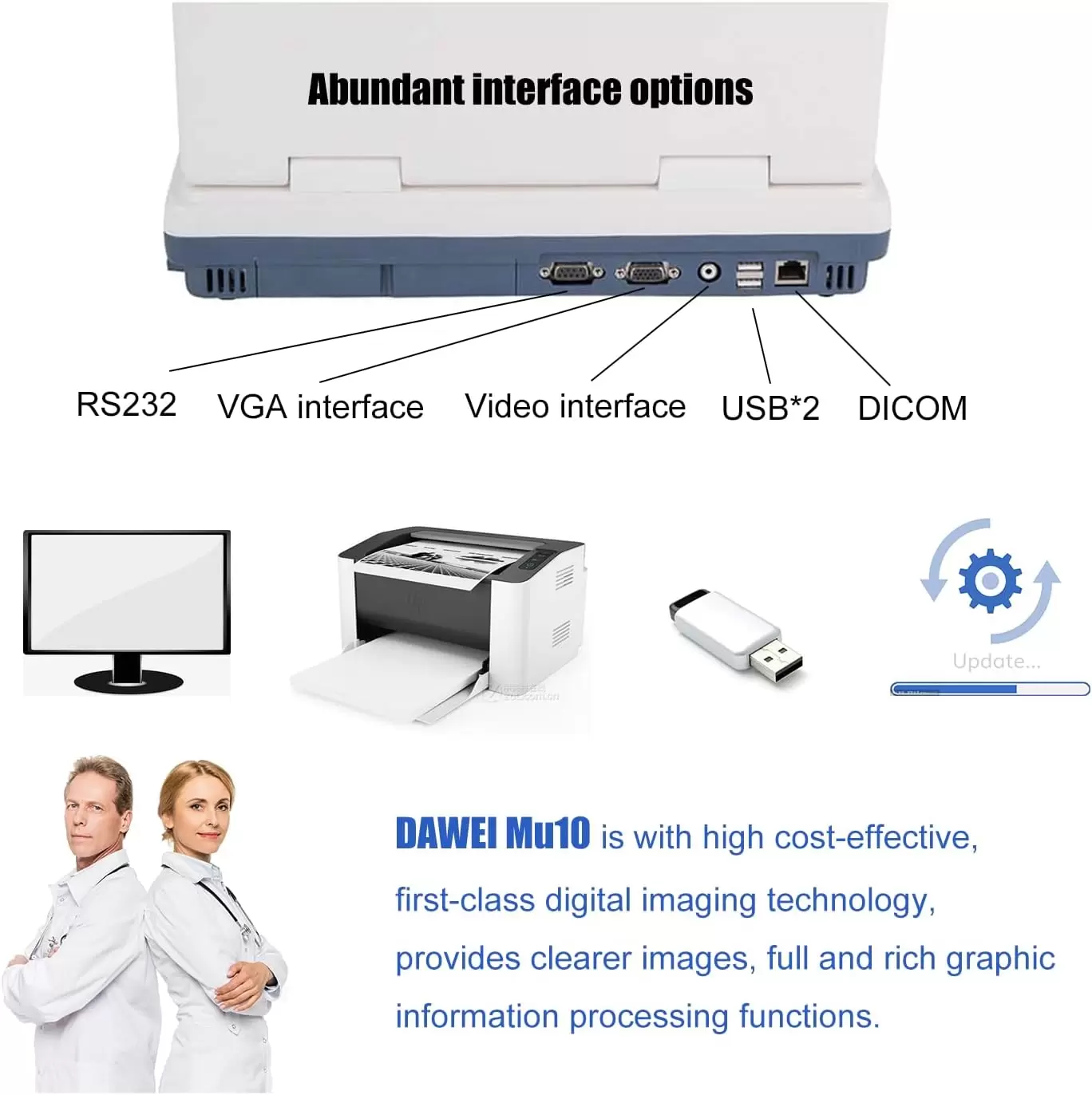 | Interfaz | RS-232, VGA, VÍDEO, 2*USB, DICOM |