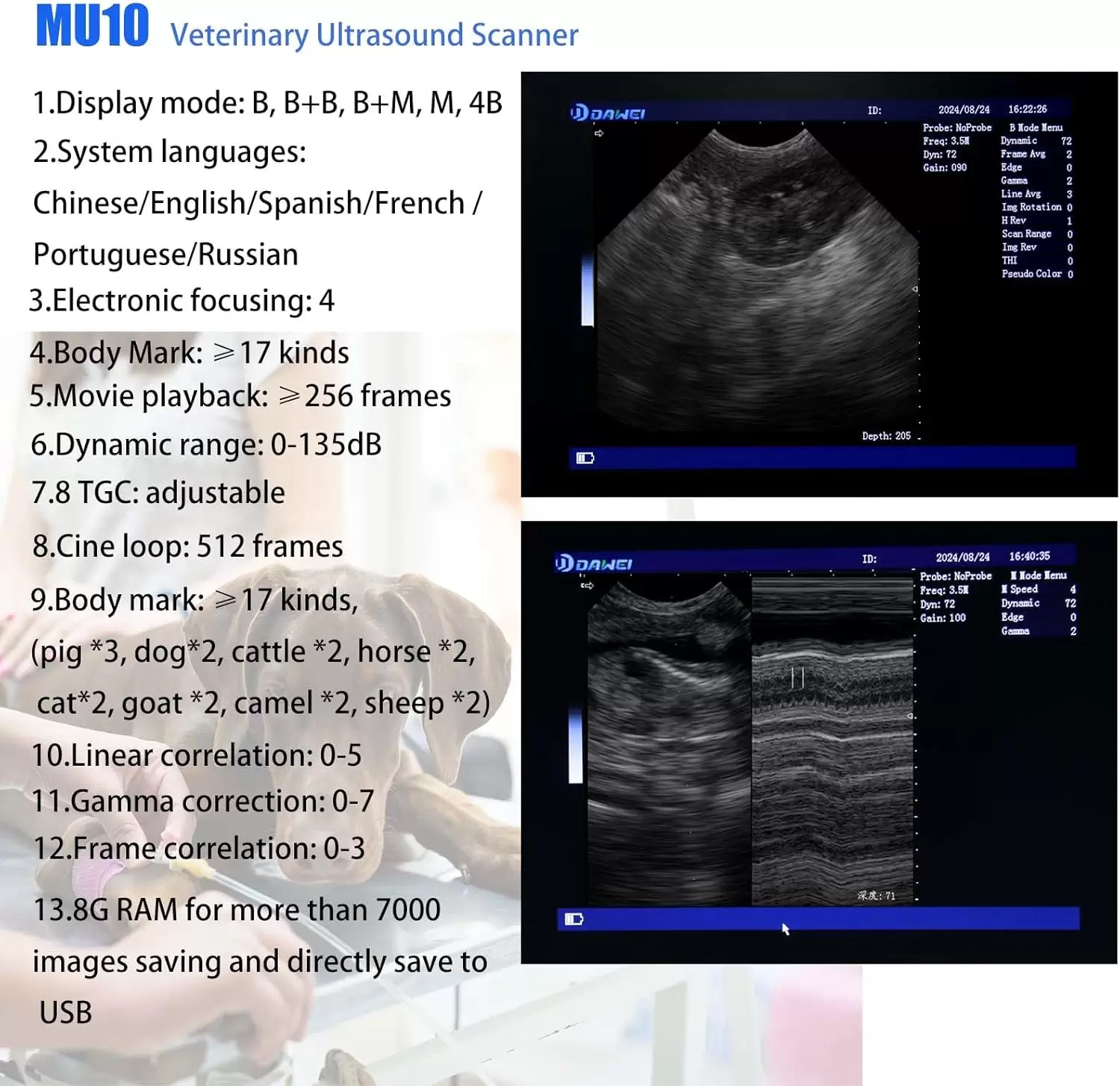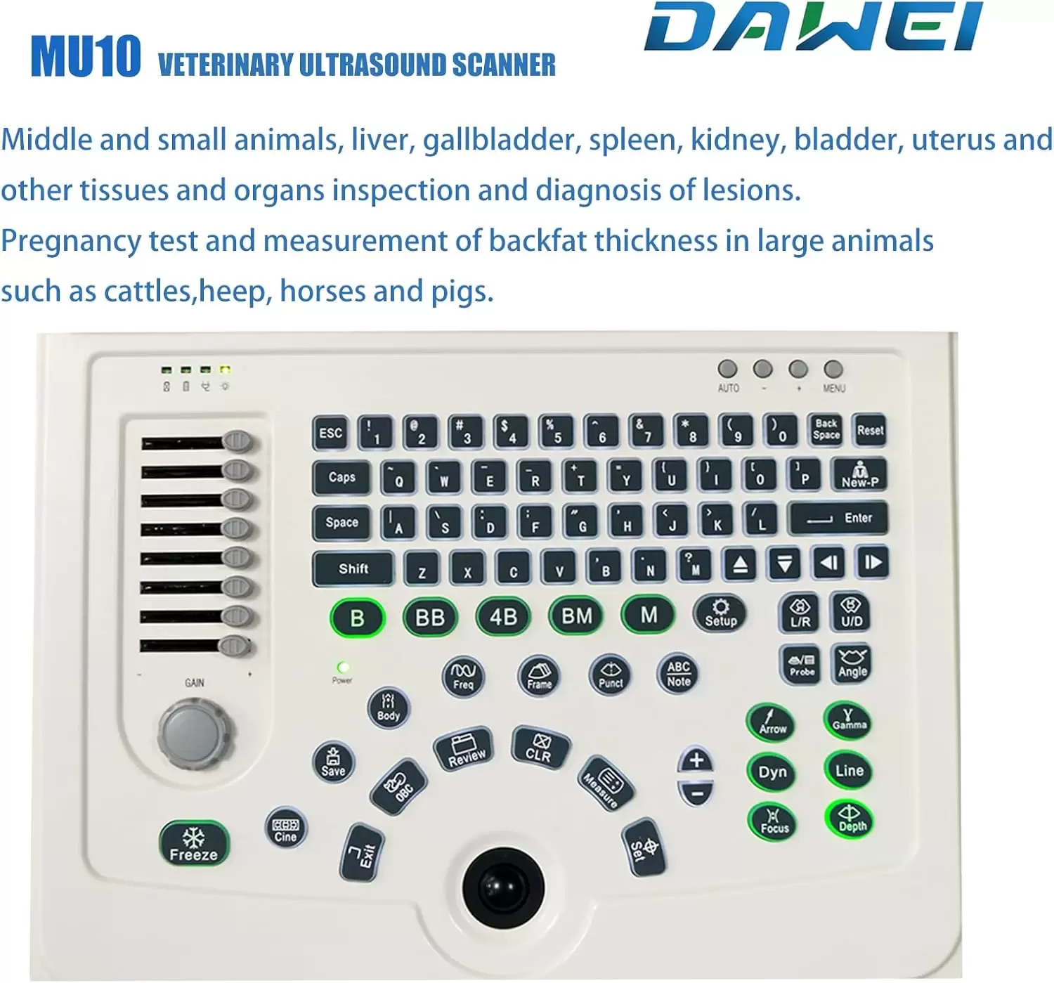 Al elegir el DAWEI MU10, obtienes más que solo el equipo: cuentas con el respaldo de Dawei Veterinary Medical Corp., Ltd., un fabricante profesional que se compromete a brindarte el servicio postventa más profesional y el entrenamiento necesario para que puedas utilizar tu nuevo ecógrafo con total confianza.