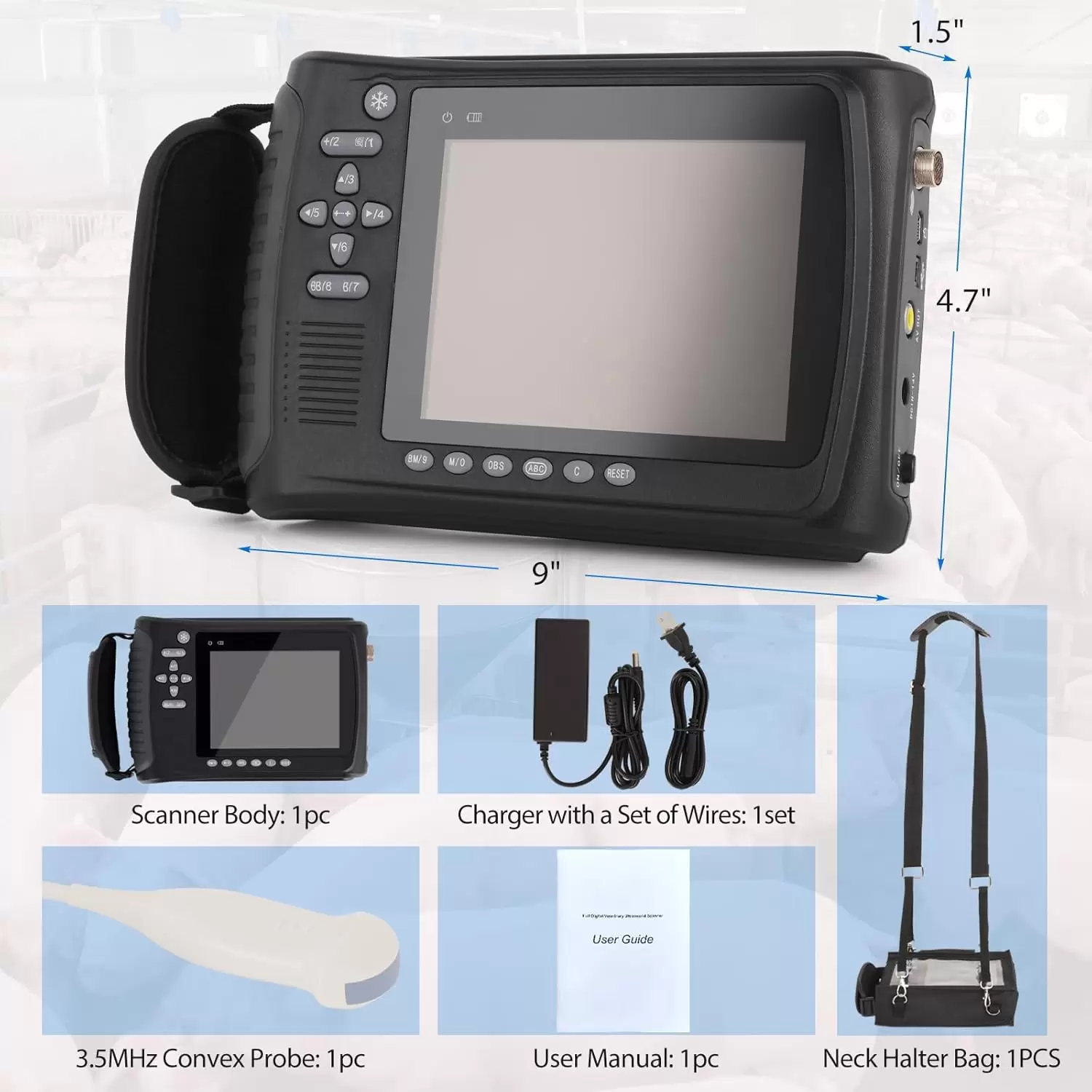 | Componentes incluidos | 1 bolsa de envoltura, 1 cargador con un juego de cables, 1 máquina de ultrasonido veterinario, 1 sonda microconvexa de 5.0 MHz |