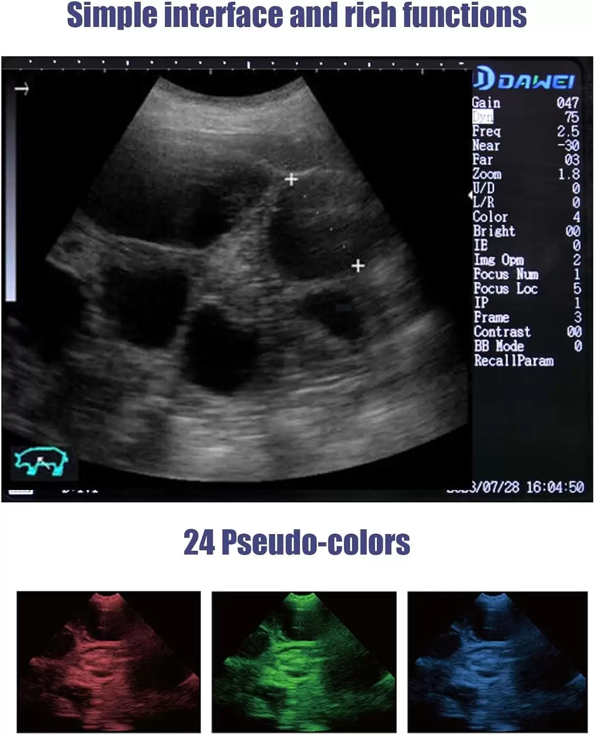 Adecuado para uso veterinario, se puede utilizar para el diagnóstico y medición de ganado, caballos, ovejas y otros animales grandes, así como gatos, perros y otras mascotas en el abdomen, obstetricia y otros sujetos