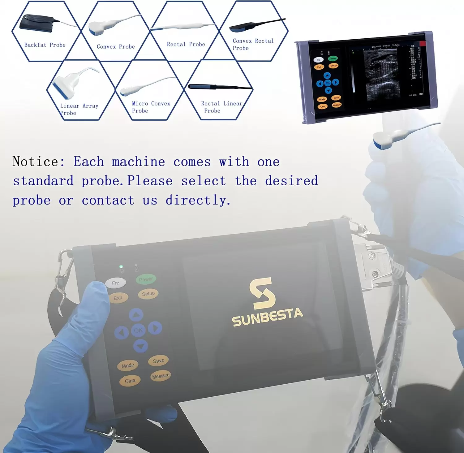 Diagnóstico Multiespecie de Gestación: Viene equipado con una Sonda Convexa de 3.5 MHz diseñada para exámenes abdominales y de gestación en múltiples especies. Es compatible con perros, gatos, cabras, cerdos, ganado y hasta especies más raras.