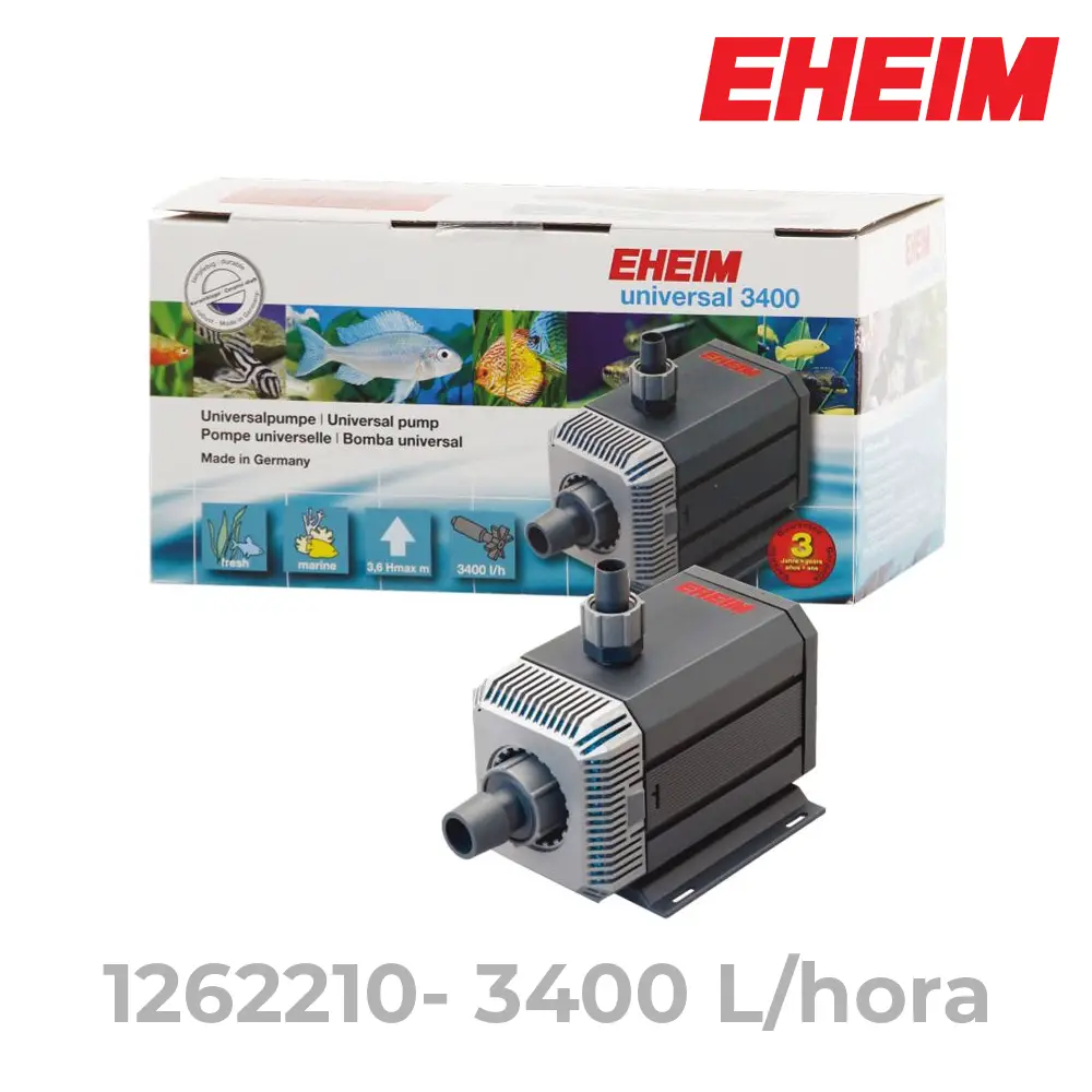 La bomba EHEIM universal 3400 es un equipo versátil y eficiente que ofrece un rendimiento constante de 3400 litros por hora. Ideal tanto para acuarios de agua dulce como marina, cuenta con un prefiltro integrado y un consumo energético bajo de 80 vatios.