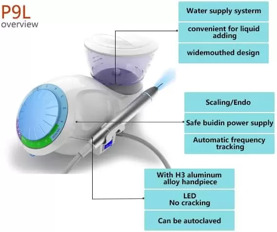 Escalador ultrasónico dental P9L con pieza de mano LED y autoclavable. Es compatible con EMS y tiene suministro de agua automático, ideal para clínicas veterinarias en todo Chile.