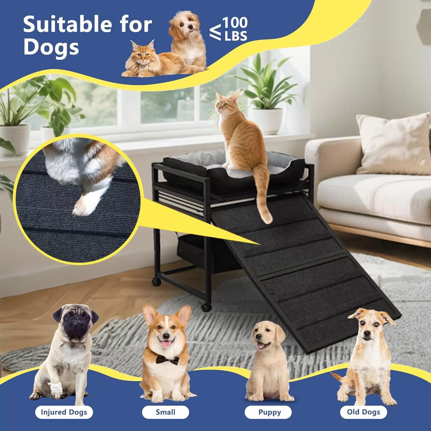 Facilita la vida de tu mascota y protege sus articulaciones con esta innovadora Estructura de Ascenso (Escalera/Rampa). Su diseño mejorado combina una pendiente suave con una superficie de tela con barras transversales que aumentan la fricción, asegurando que perros y gatos de todos los tamaños (pequeños, mayores o lesionados) suban y bajen con seguridad, previniendo resbalones y cuidando sus rodillas.