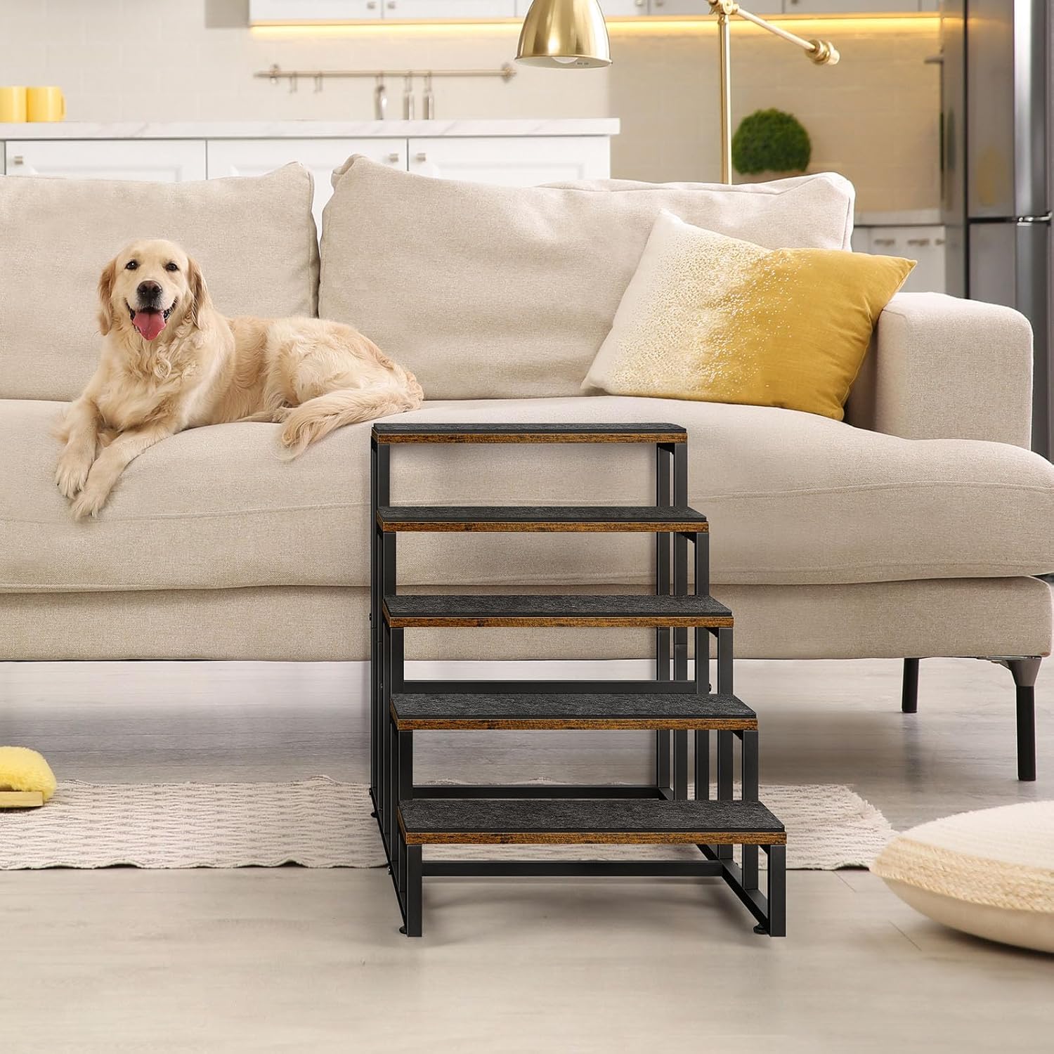 Estables y resistentes: las escaleras OYEAL para perros y gatos están hechas de tablero de partículas resistente y duradero y material metálico. Diseñado con una estructura triangular resistente para soportar el peso de perros grandes (capacidad máxima de peso: 100 libras). Además, cada escalón de las escaleras para mascotas está cubierto con un hilo que mejora el agarre para evitar resbalones, deslizamientos y posibles lesiones durante el movimiento y la escalada.