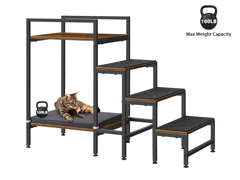 Patas antideslizantes y ajustables: equipadas con patas ajustables en la parte inferior, los escalones para mascotas pueden mantener el nivel incluso en suelos irregulares, evitando arañazos y daños en el suelo. El peso máximo de soporte de la cama superior e inferior es de 110 libras, se puede utilizar durante mucho tiempo