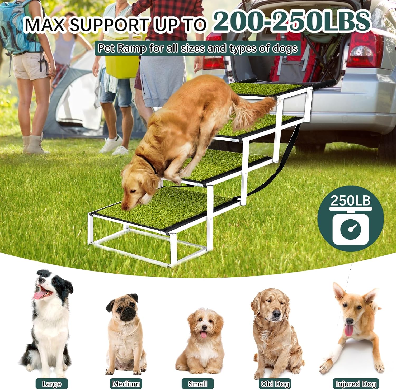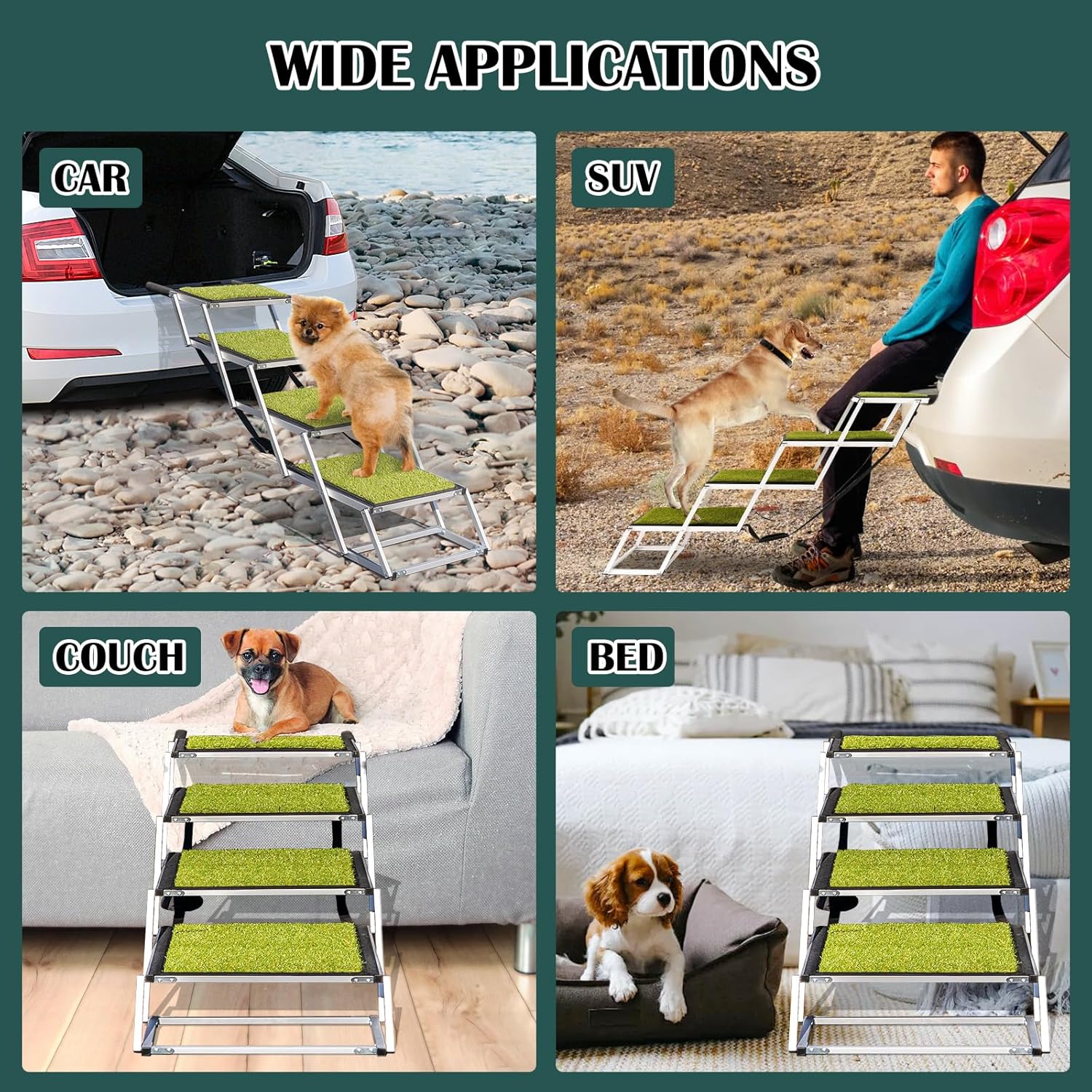 ESCALERAS MULTIFUNCIONALES PARA PERROS: Estos 4 escalones extra anchos para perros tienen dos ángulos para elegir: ángulo bajo y estiramiento normal. La altura ajustable significa que es adecuado para una variedad de perros para usar en diferentes escenas, se aplica ampliamente al exterior de la casa para entrar en la mayoría de los vehículos, también en interiores para cachorros, perros de patas cortas para llegar a camas altas, sofás, ventanas, etc. Si tienes perros grandes, perros artríticos, cachorros o gatos que no pueden escalar solos, esta escalera para perros es para ti