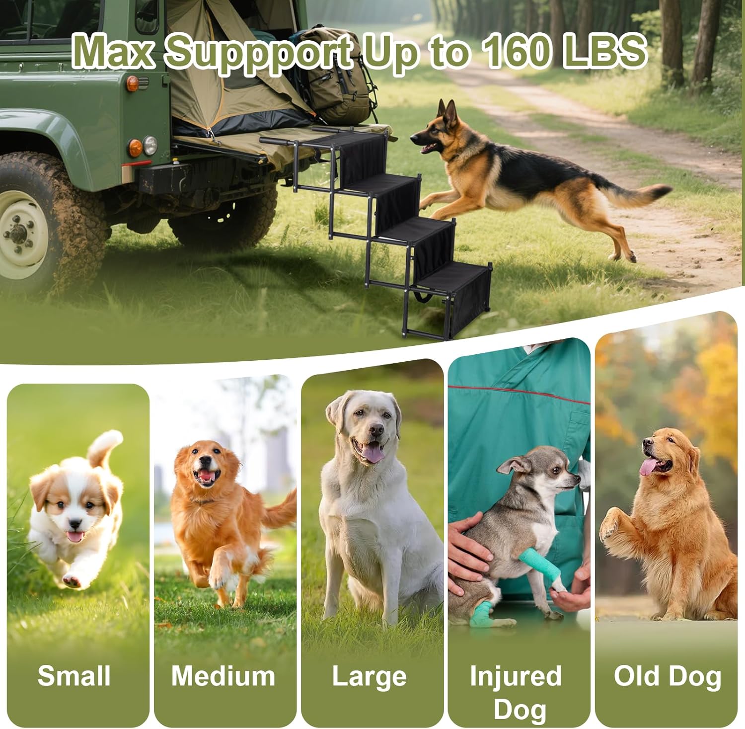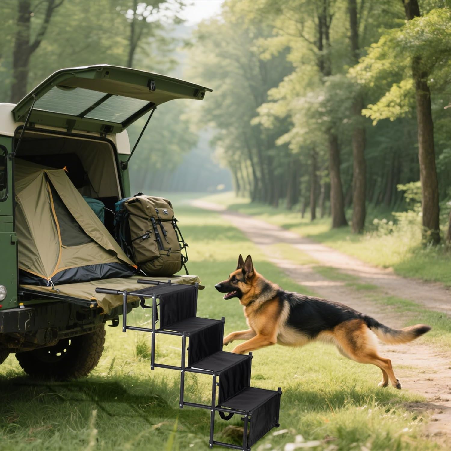 Ligero y estable: las escaleras ligeras para mascotas están hechas con un marco de aluminio pero resistente. A pesar de pesar solo 8 libras, están diseñados para durar y pueden soportar perros que pesan hasta 200 libras. Cada escalón es increíblemente duradero y puede soportar un uso pesado. Nuestro diseño de escaleras extra anchas de 4 escalones para acomodar vehículos con una altura de 30 pulgadas