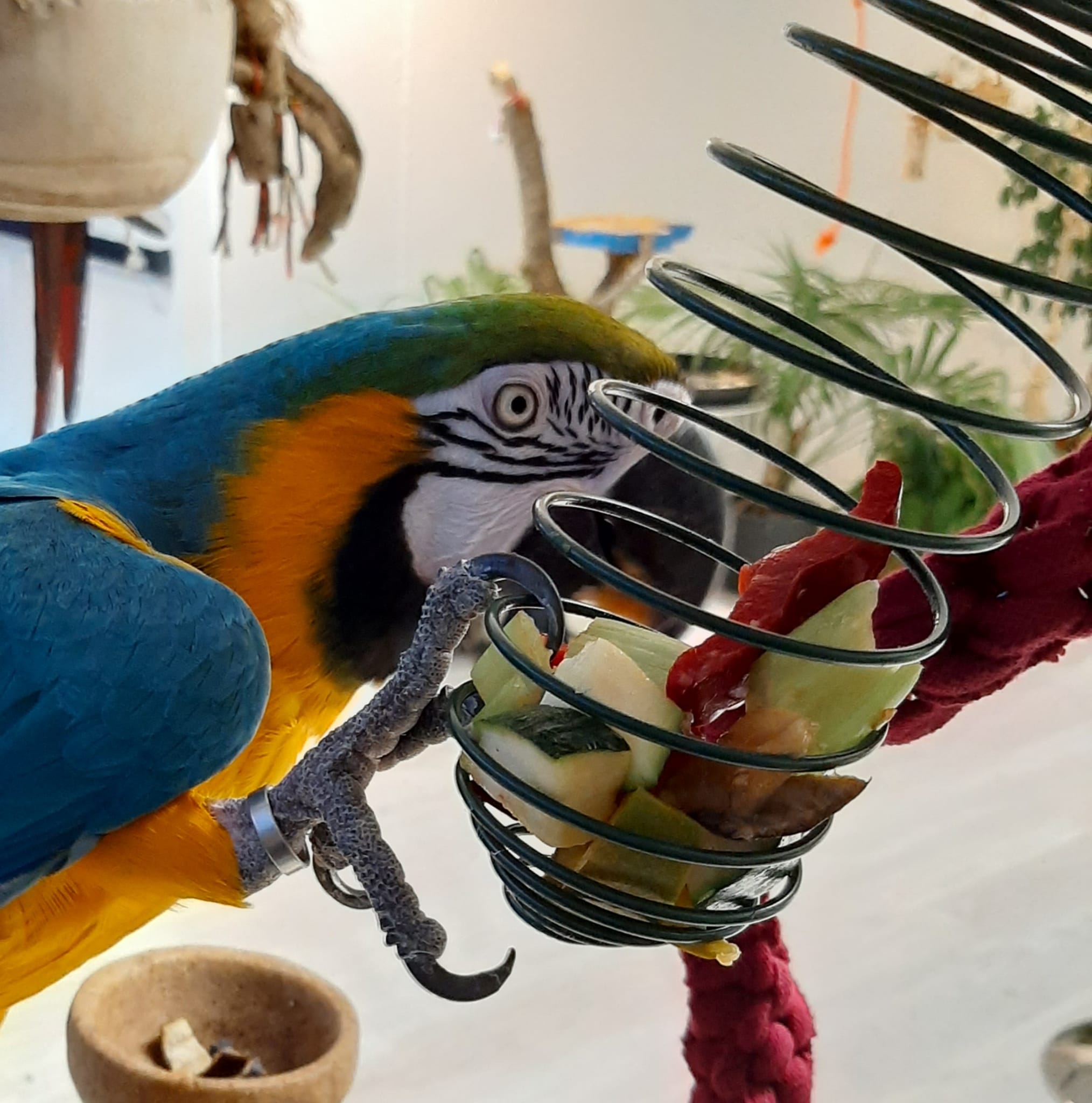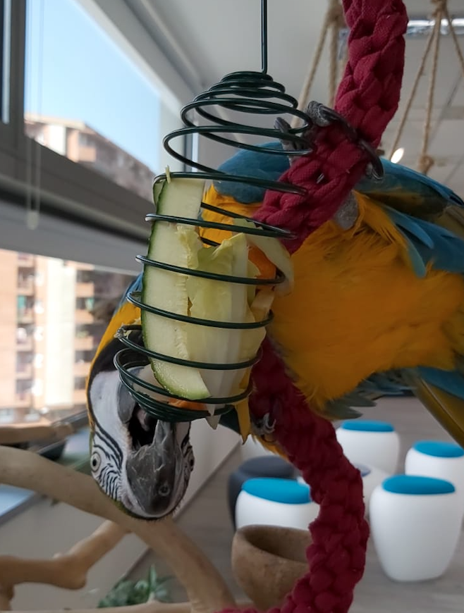 Este porta frutas en forma de espiral tiene un grado de dificultad de fácil a medio. Es ideal para aves de talla mediana y grande.