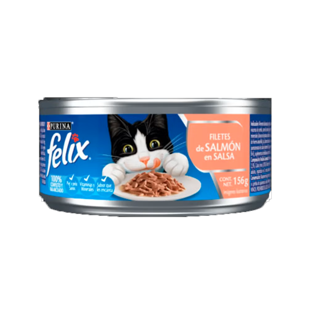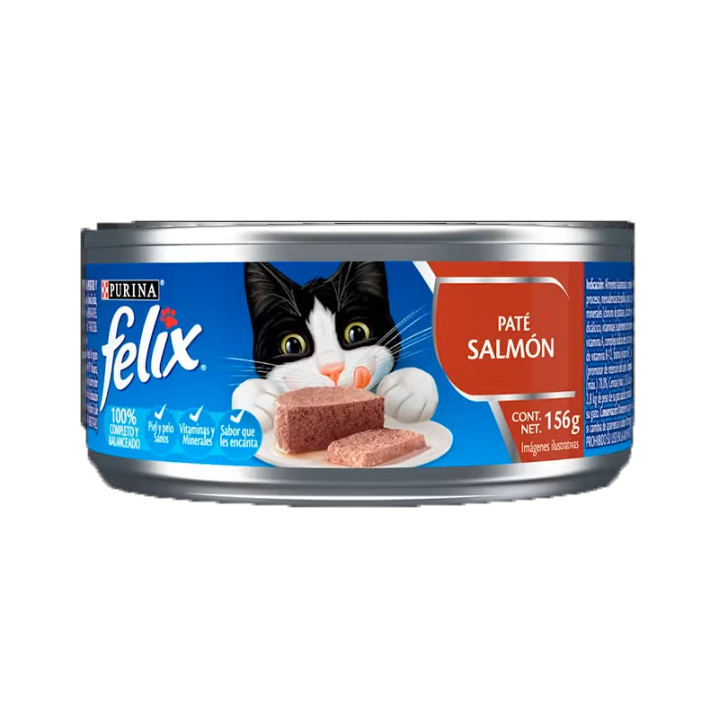Purina® Felix® Paté de Salmón tiene una textura irresistible, deliciosa Salsa, deliciosos Fileticos, tiernos Trocitos, sabrosísimo Paté Alimento balanceado y completo húmedo para gatos adultos en mantenimiento.