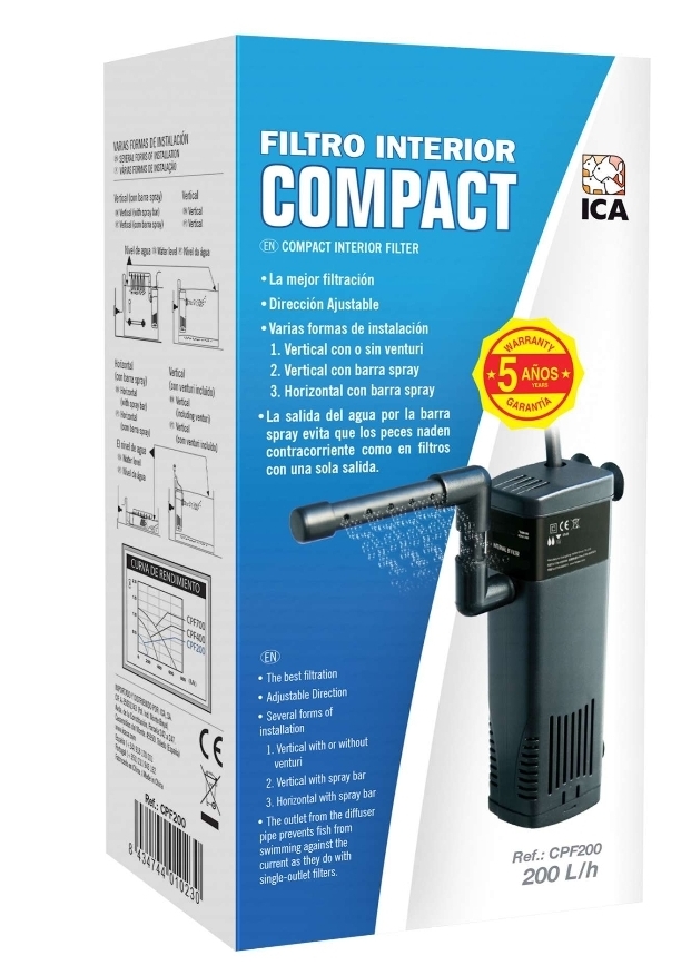 El nuevo Filtro Interior Compact, está fabricado con plástico no tóxico de la mejor calidad y con excelentes acabados. Puede ser utilizado tanto en acuarios como en tortugueras. Ya que gracias a su diseño y a los accesorios de salida puede ser colocado en vertical y en horizontal.