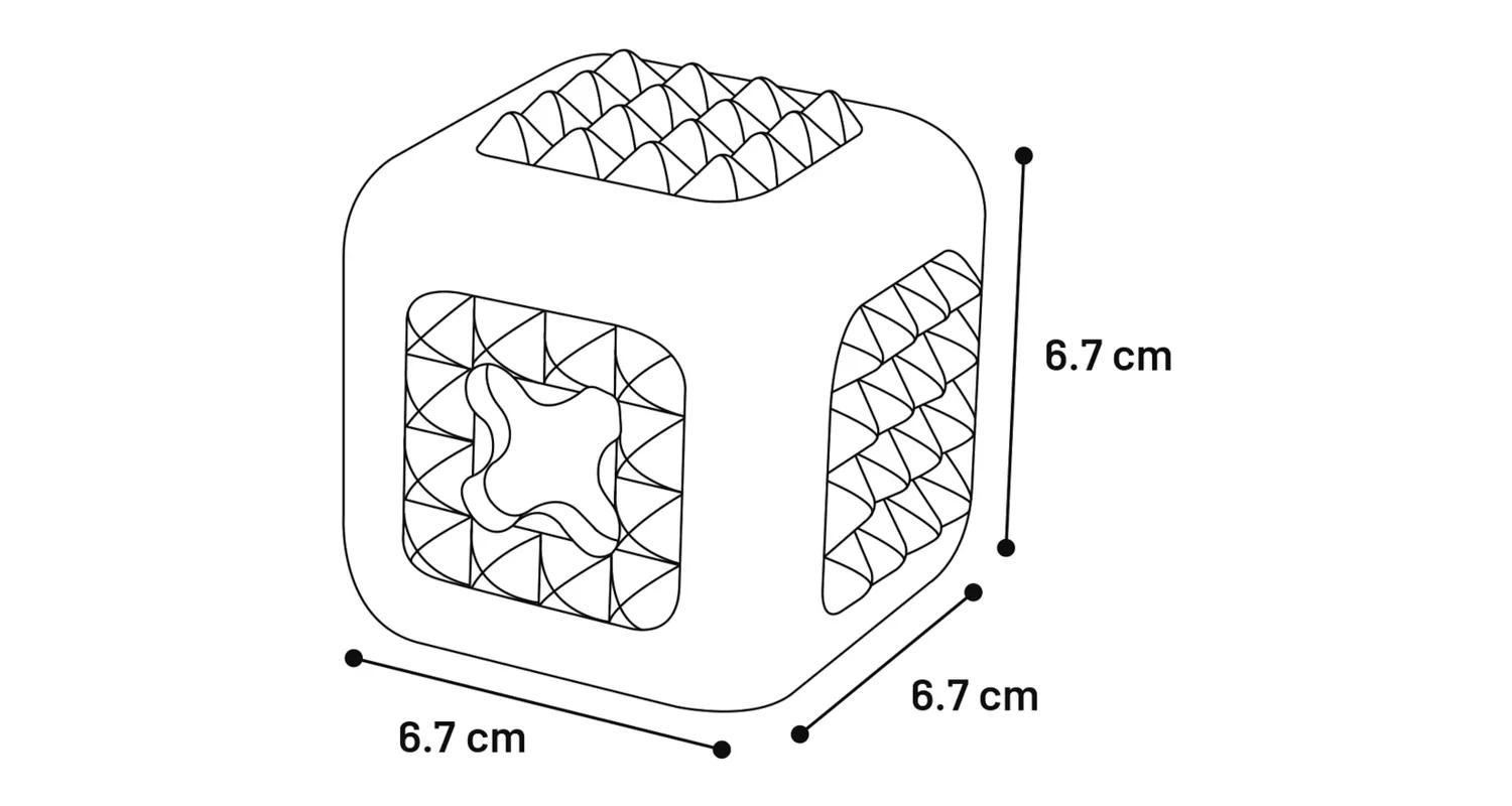 Este juguete para perros juguetón tiene forma de cubo con lados resistentes a mordiscos. Los puntos y el agujero en forma de cruz proporcionan un buen agarre. ¡Perfecto para llevar a cualquier lugar!