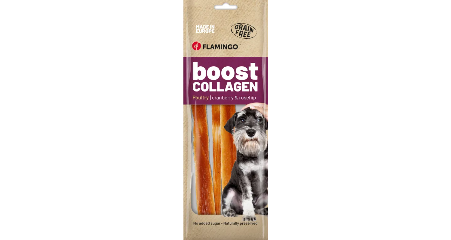 ¡Mima a tu perro con el Snack Boost ! Esta golosina sin cereales contiene colágeno para una piel y articulaciones saludables, y un pelaje brillante. Con glucosamina y condroitina para un apoyo adicional. Conservantes naturales y fabricado en Europa.
