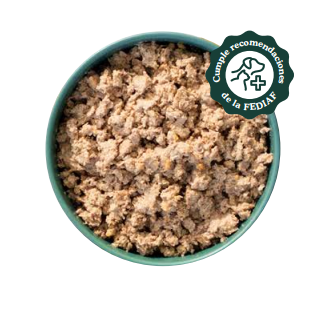 Pollo 94,5% (carne 48%, corazón 43,5%, hígado 3%);