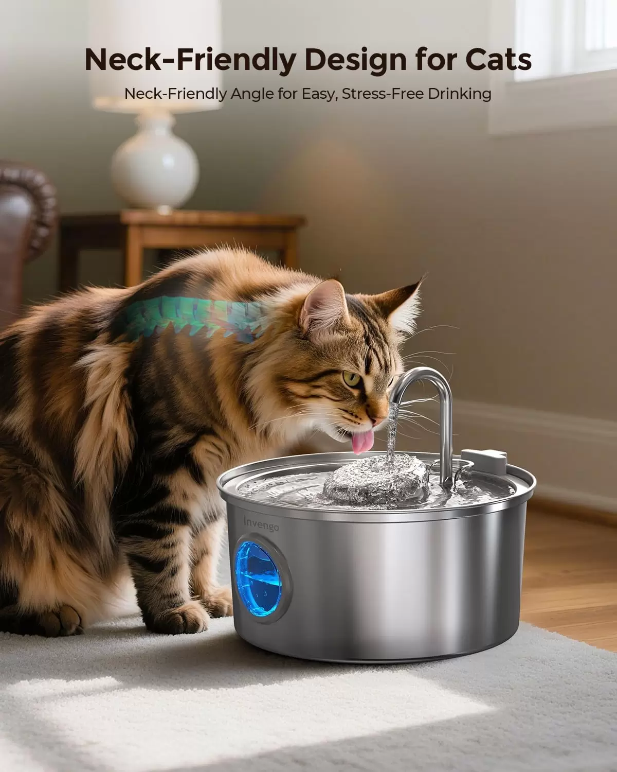 Fuente de 3.2L en acero inoxidable con ventana visible. Operación ultra silenciosa (20dB), incluye 4 filtros y diseño anti-salpicaduras. La opción más tranquila y limpia para tu hogar.