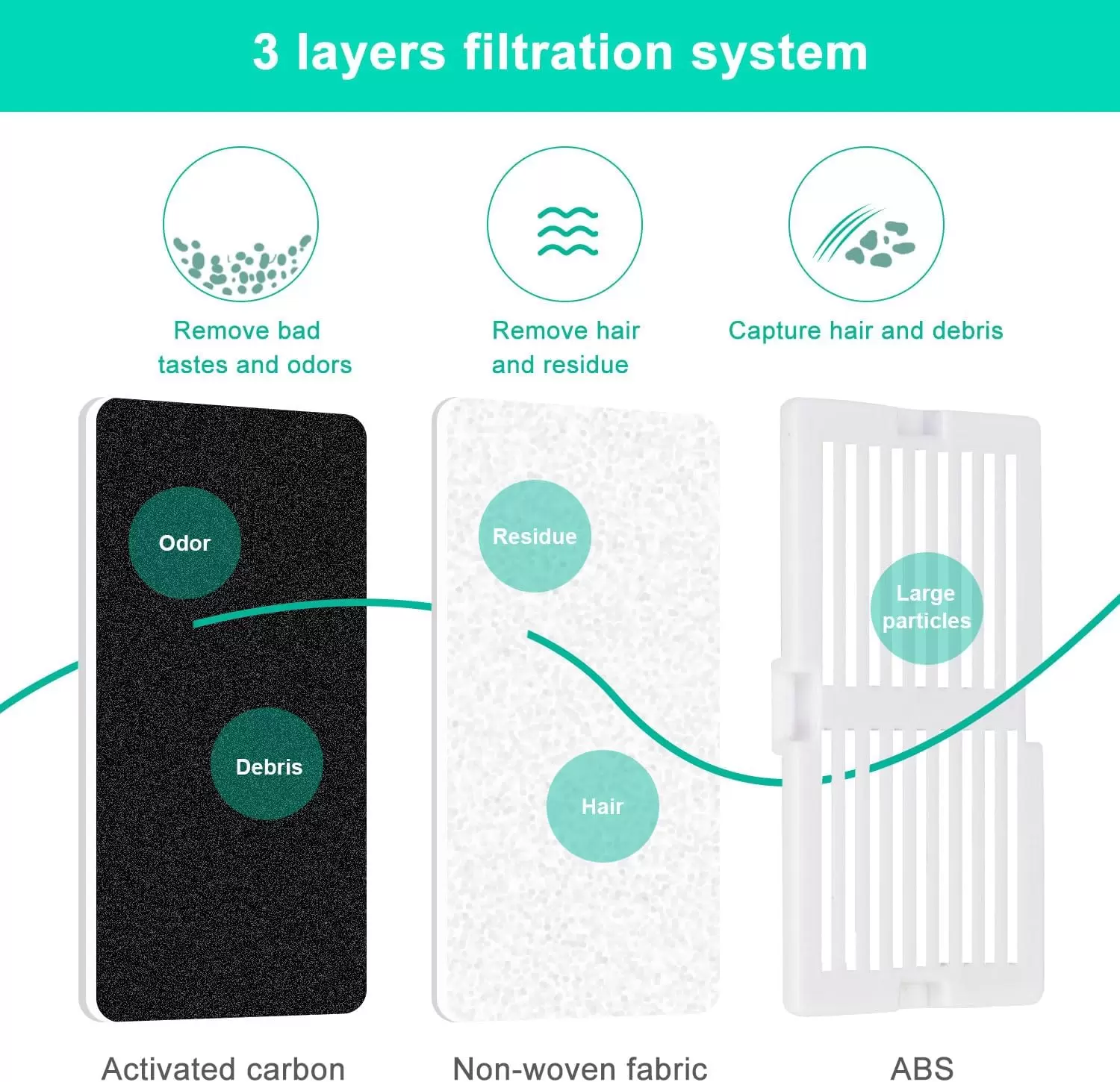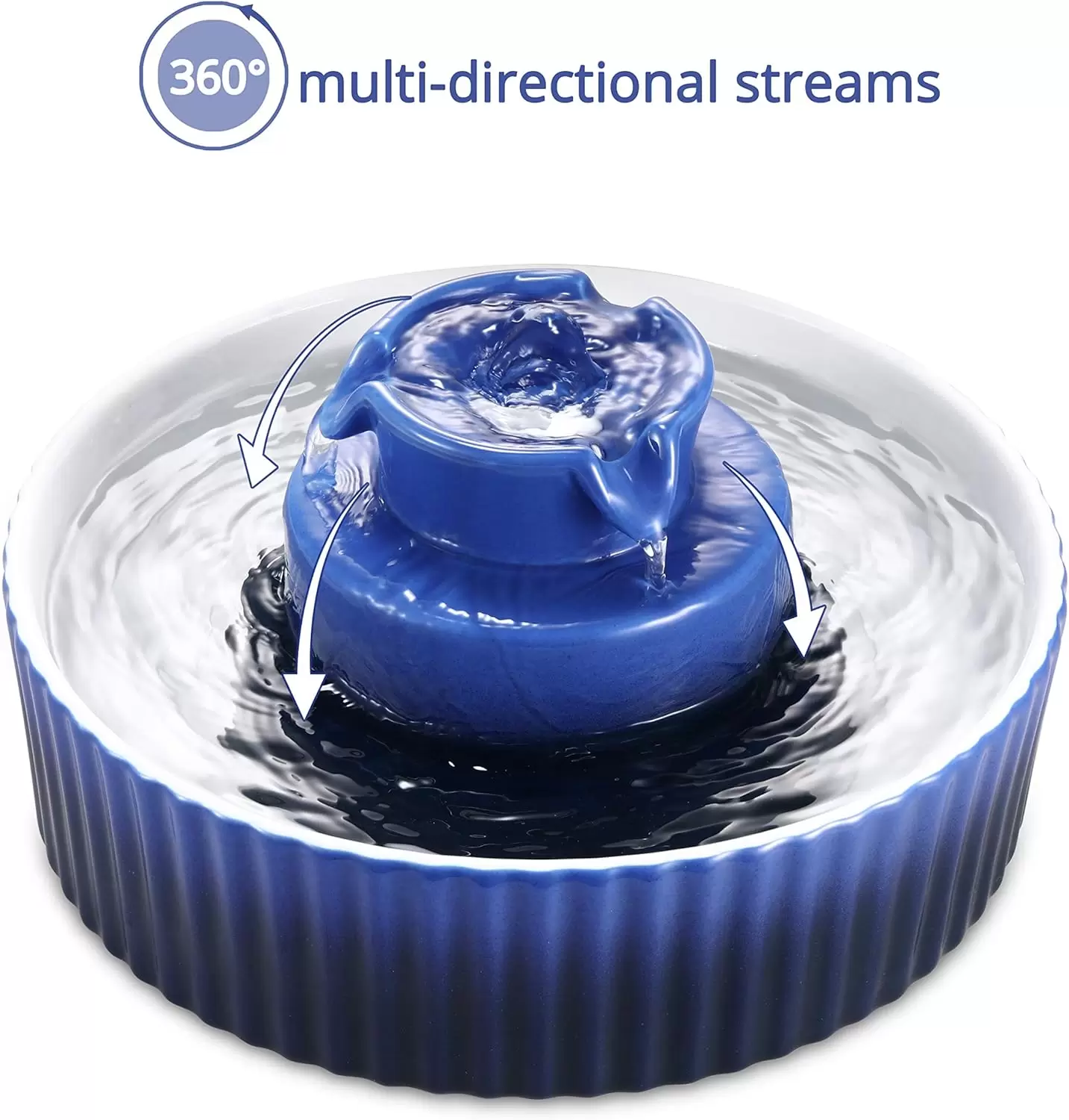 Fuente de cerámica de 2.1L. El pack más completo: incluye 2 bombas (una de repuesto) y 3 filtros. Diseño 360°, higiénica, pesada y ultra silenciosa. La mejor inversión a largo plazo.