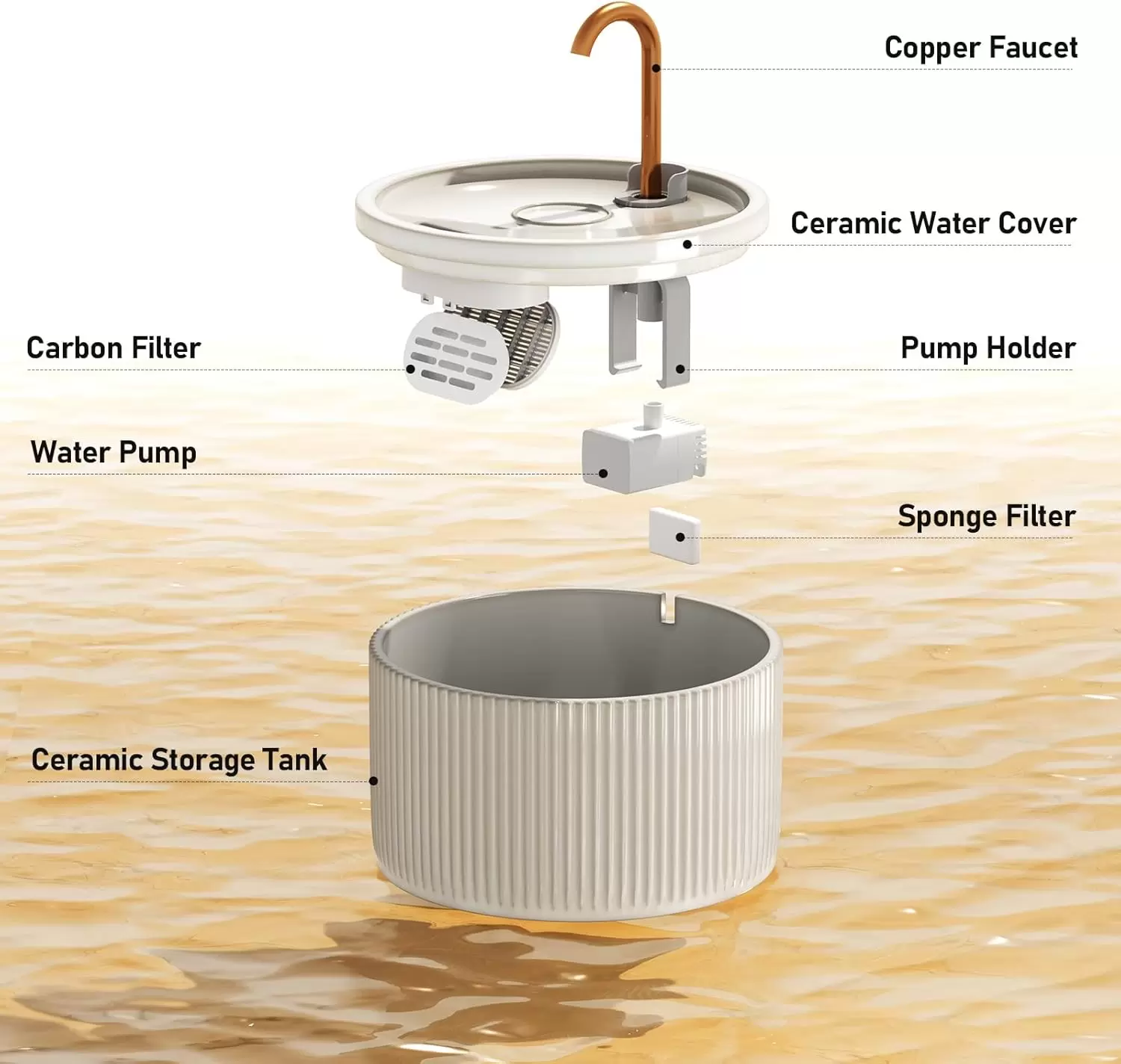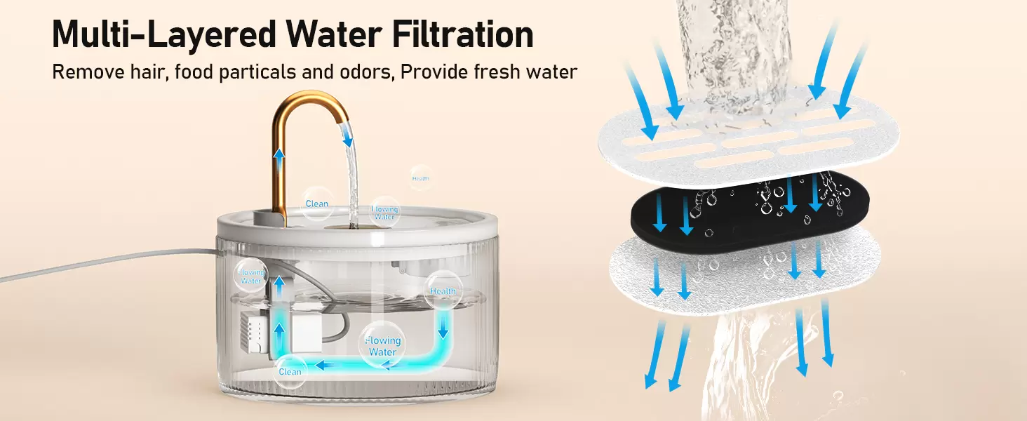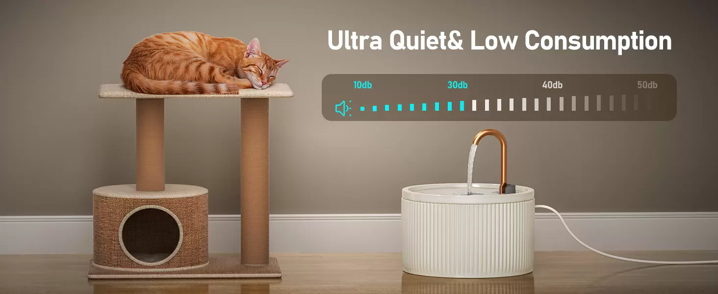Olvídate de las fuentes de cerámica complicadas. Nuestro diseño integrado de bomba hace que el montaje y desmontaje sea rapidísimo para una limpieza sin estrés. Su sistema de filtración doble (carbón + esponja) purifica el agua, mientras que su bomba de ultra bajo consumo (0.7W) opera a menos de 30 dB, siendo prácticamente inaudible para garantizar tu descanso.