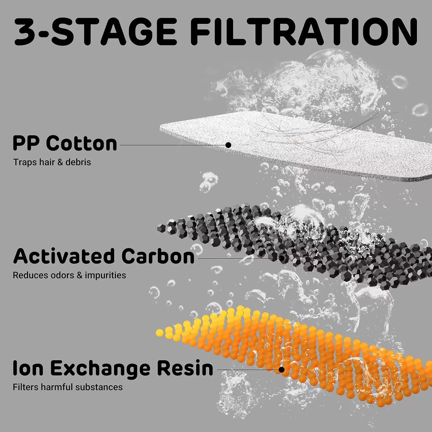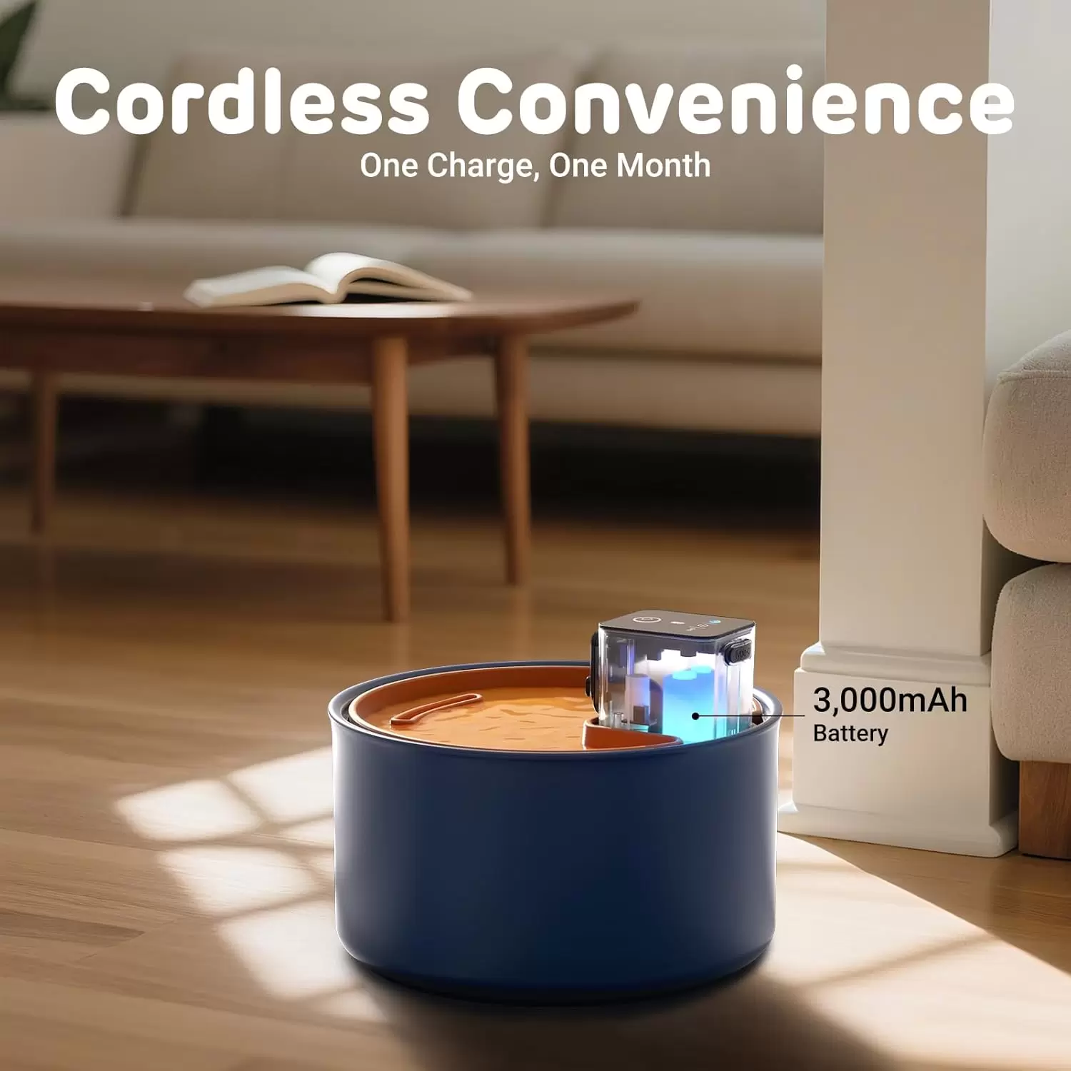 Diseñada para el hogar moderno, su batería recargable de 3000 mAh permite un uso 100% inalámbrico. Puedes colocarla en la sala, el dormitorio o lugares sin enchufes con total libertad. Con un tanque de 3.5 Litros, asegura agua fresca de 7 a 15 días, ideal para hogares con múltiples mascotas o dueños que viajan.