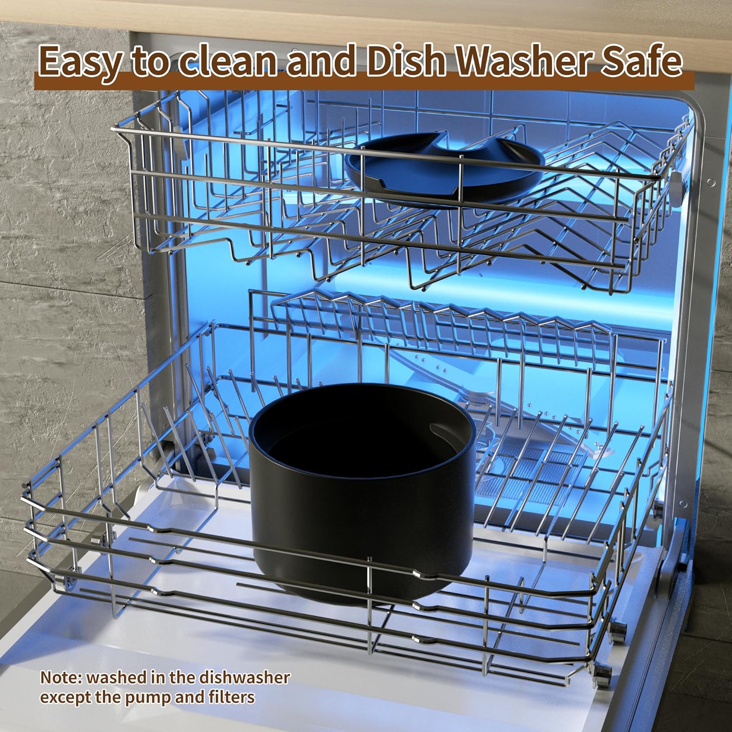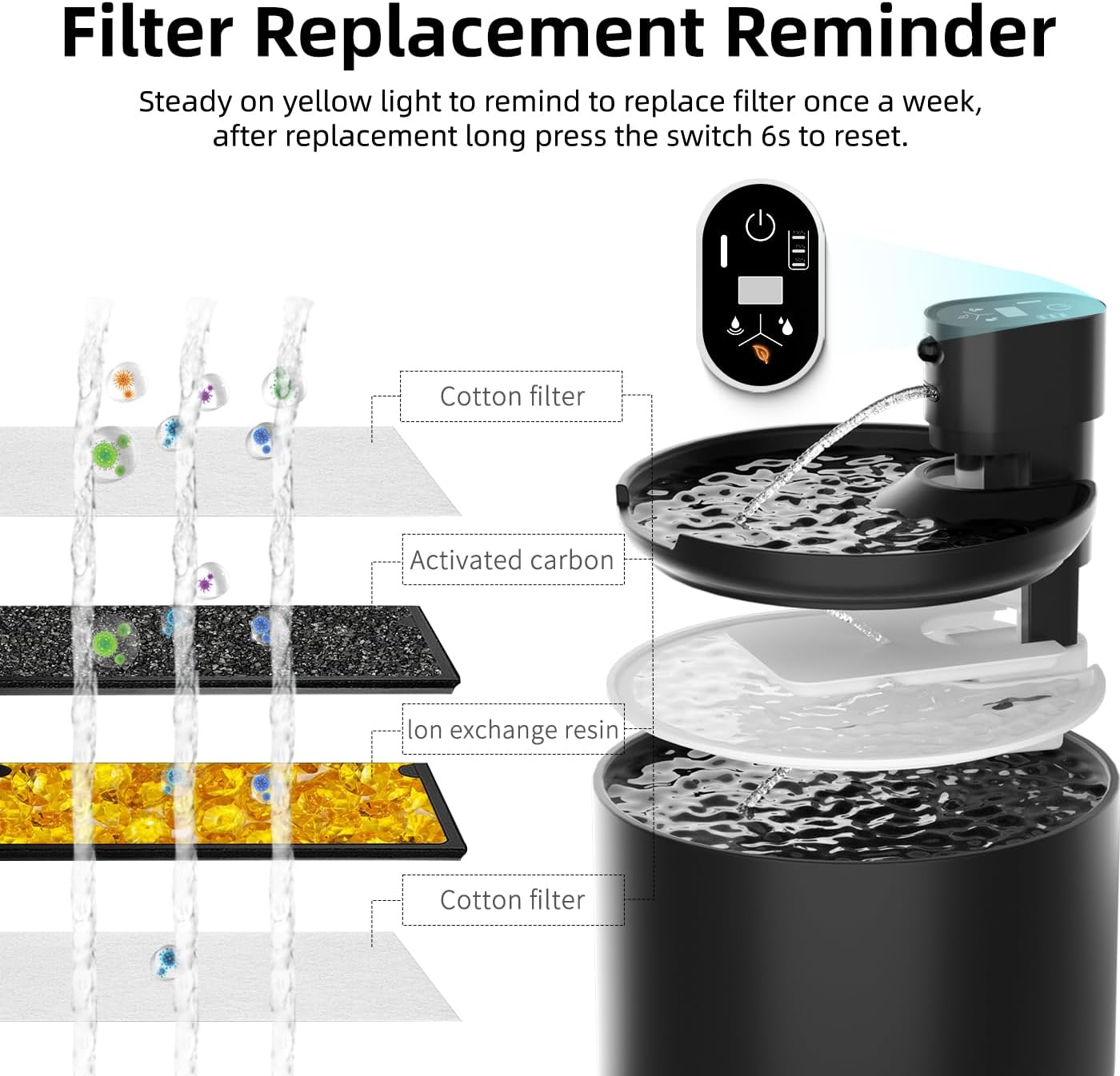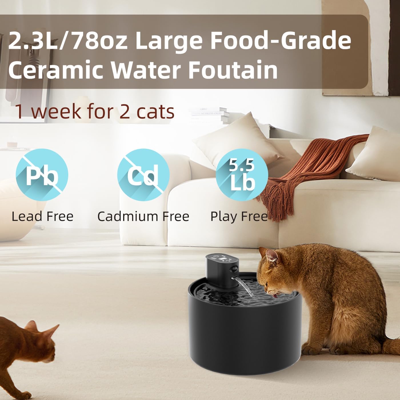 Gran capacidad: con una capacidad de 78oz/2.3L, esta fuente de agua puede proporcionar suficiente agua para una mascota durante más de 2 semanas. Es perfecto para los dueños de mascotas que viajan, ya que reduce la necesidad de recargas frecuentes. El diseño elevado de la fuente es más fácil para tu gato o perro beber sin bigotes o fatiga del cuello desde la altura perfecta. El cuerpo de cerámica de 5.5 libras minimiza el riesgo de ser derribado por mascotas.