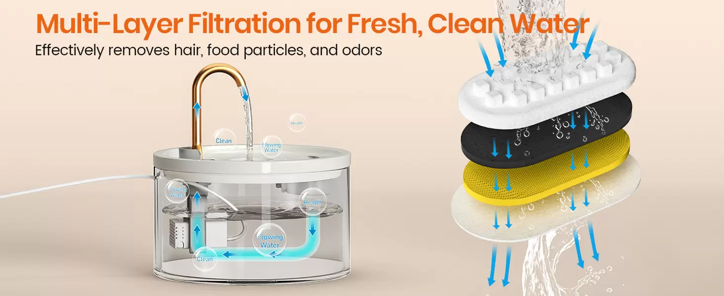 Sistema avanzado de filtración dual para agua más limpia: esta fuente de bebida para gatos incluye un sistema de filtración de doble capa. Un filtro de esponja atrapa los desechos y el cabello, mientras que un filtro de carbón activado reduce las impurezas y los olores, mejorando el sabor. Las fuentes de agua MISFANS para gatos en interiores proporcionan agua más limpia y saludable para una mejor hidratación y salud general de las mascotas.