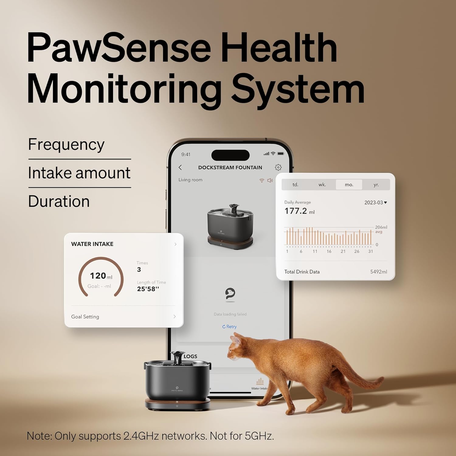 Sistema de monitoreo de salud PawSense: la aplicación PETLIBRO utiliza este sistema para registrar exhaustivamente los datos de hidratación y brindarle acceso a informes claros y fáciles de leer, asegurando que su gato esté saludable. (El dispositivo solo admite redes Wi-Fi de 2.4 GHz, no se admiten redes de 5 GHz)