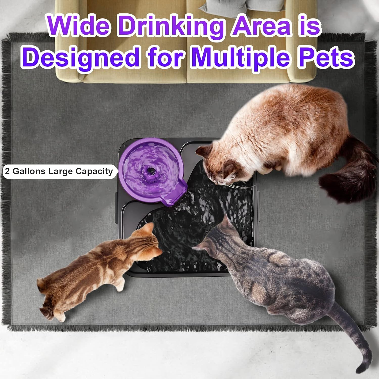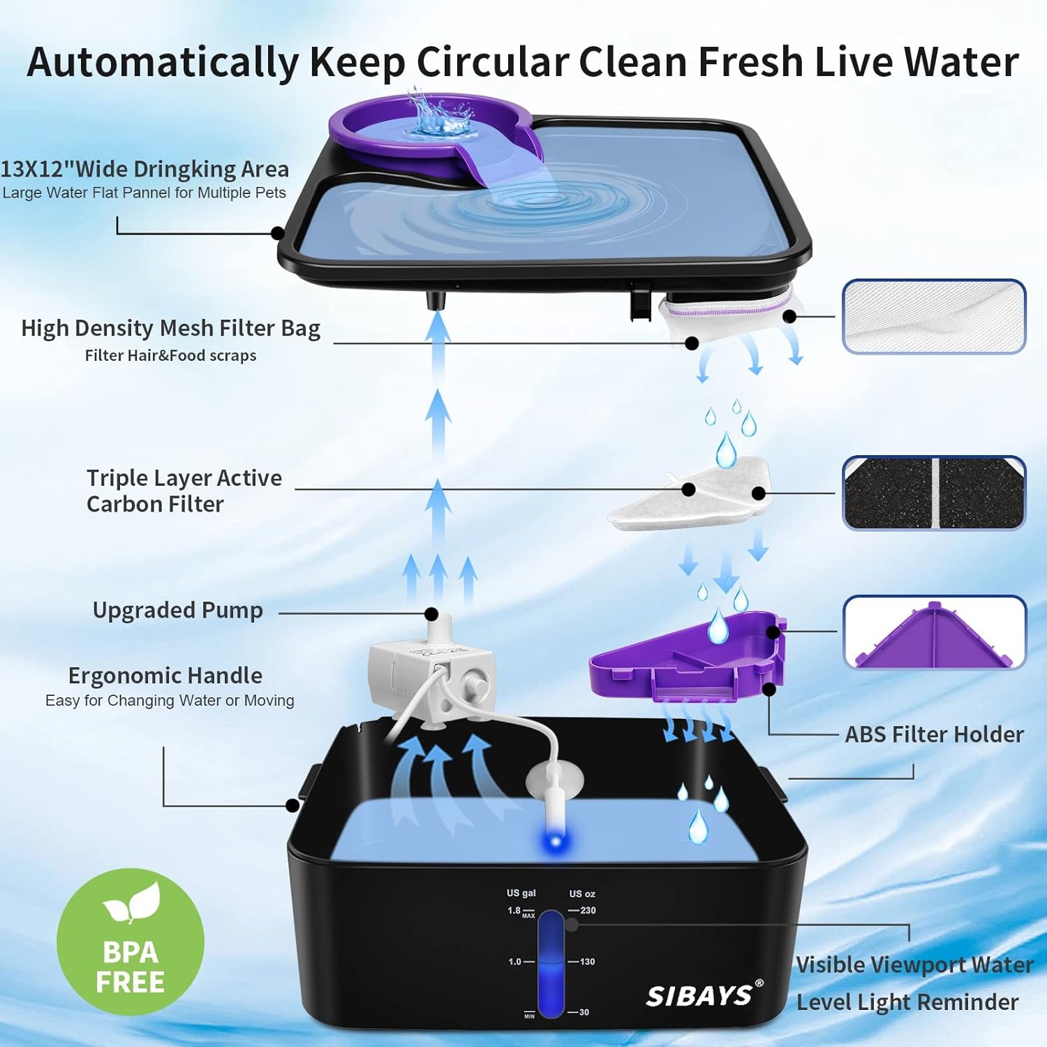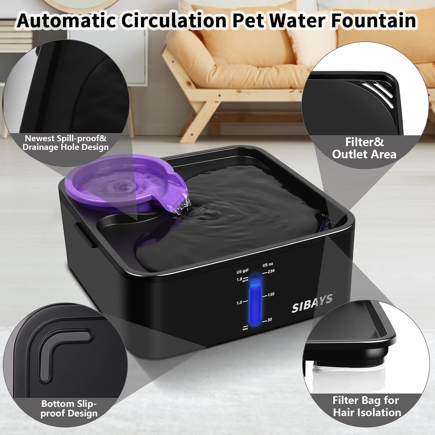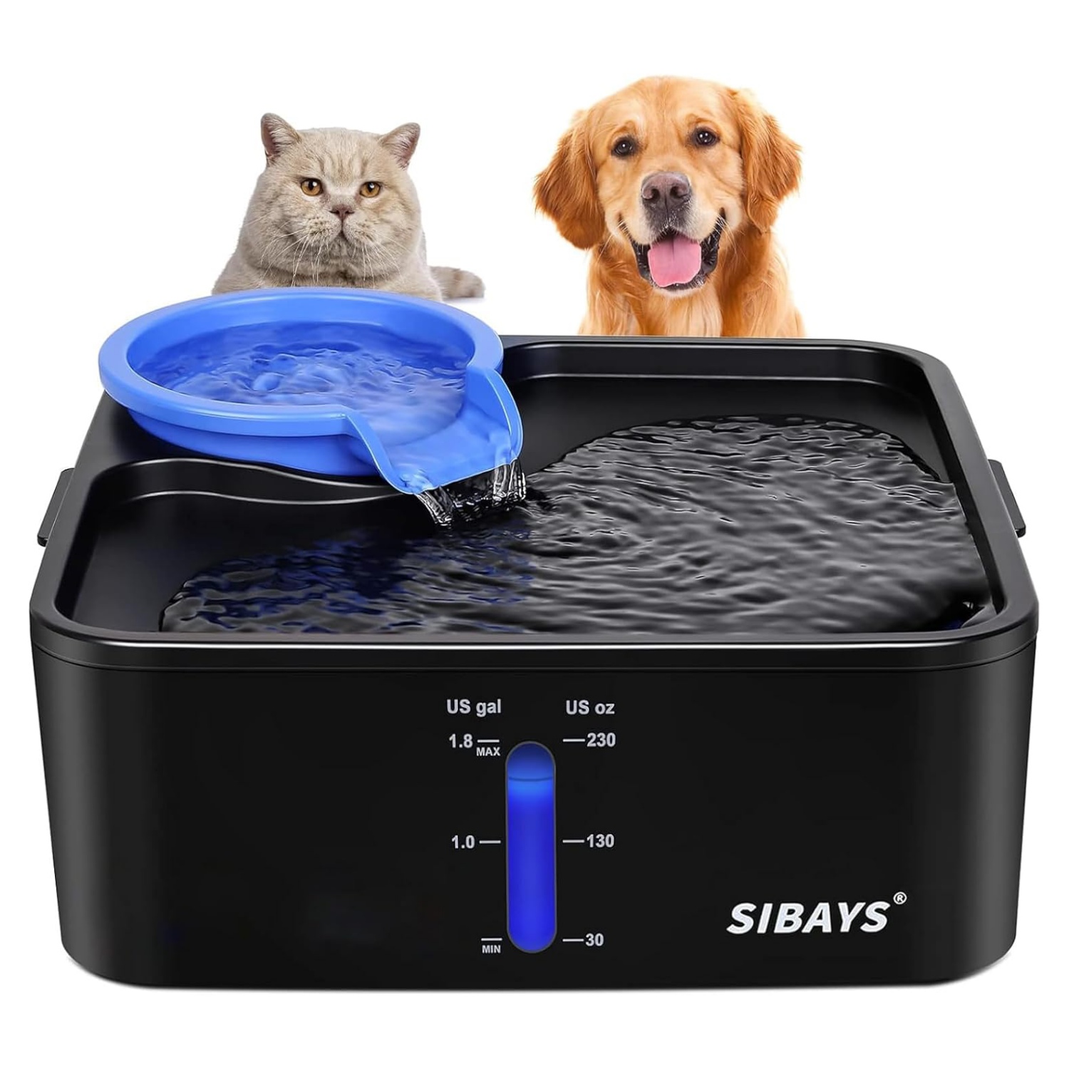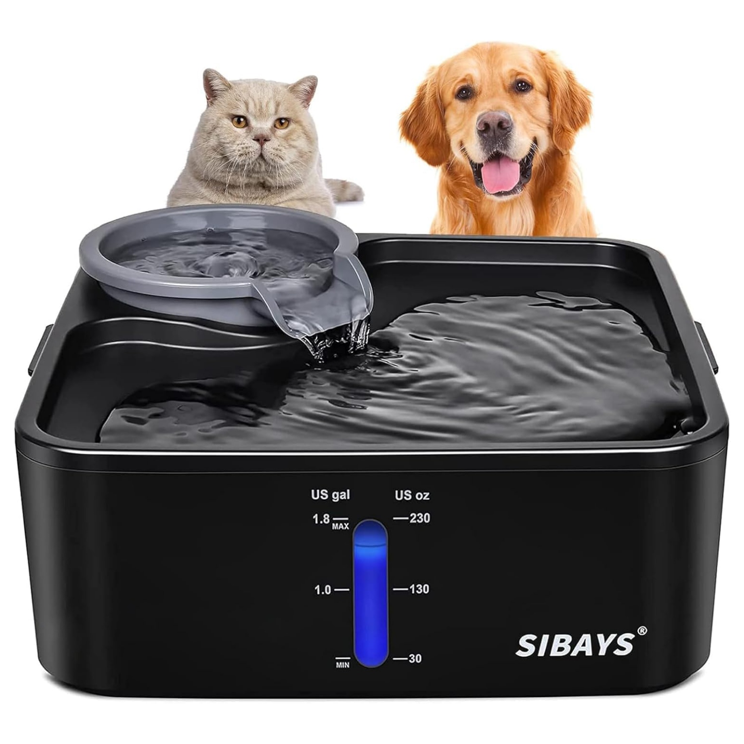 Gran capacidad de 230 onzas y suficiente espacio para beber: la fuente de agua para gatos SIBAYS con volumen de 1.8 galones es la solución perfecta para perros y gatos de todas las razas y múltiples mascotas que beben. El agua fluye automáticamente para que el agua dulce llegue a la parte superior y atrae a las mascotas a beber. Si tienes varias mascotas, el espacio para beber cuadrado inferior es suficiente para que las mascotas se reúnan bebiendo.
