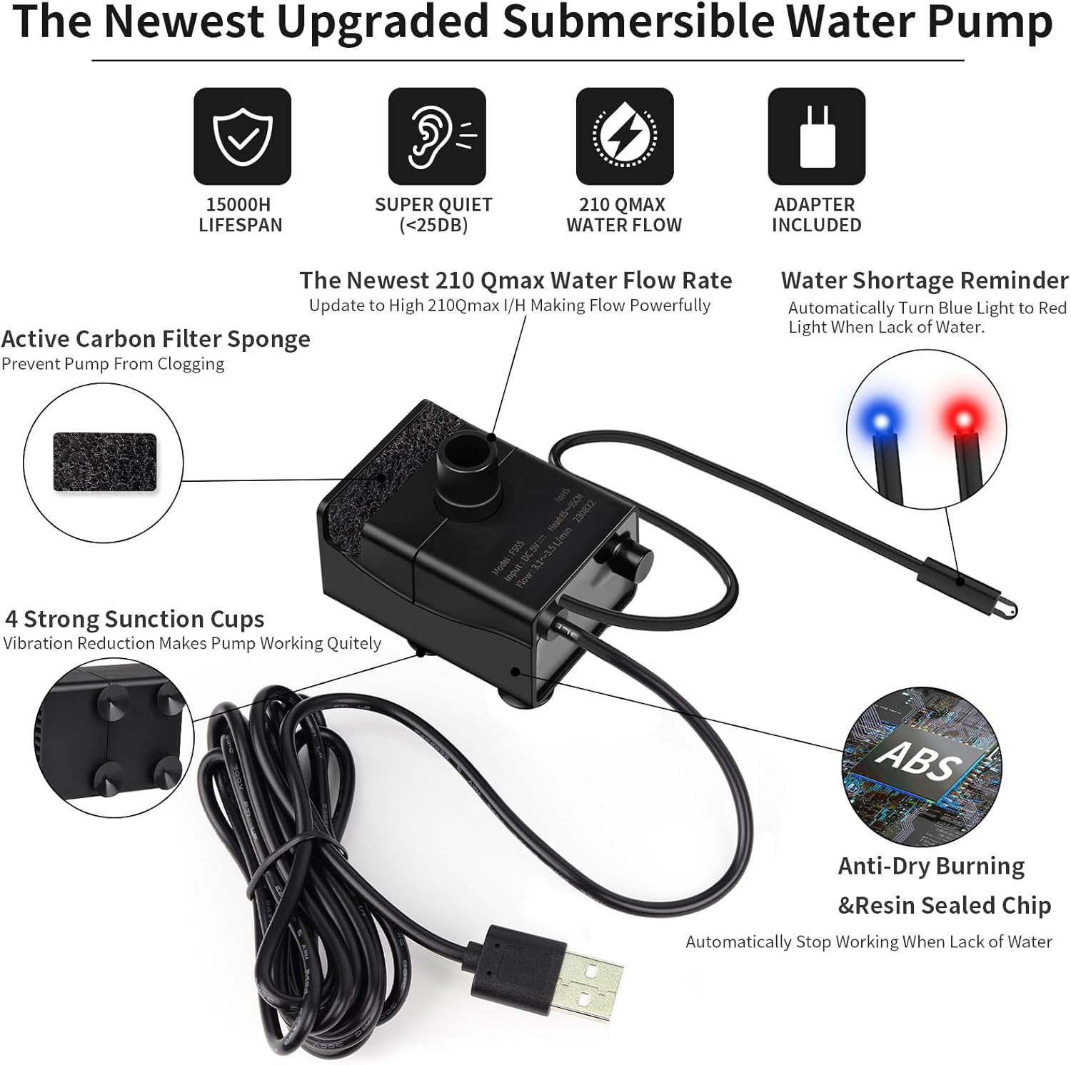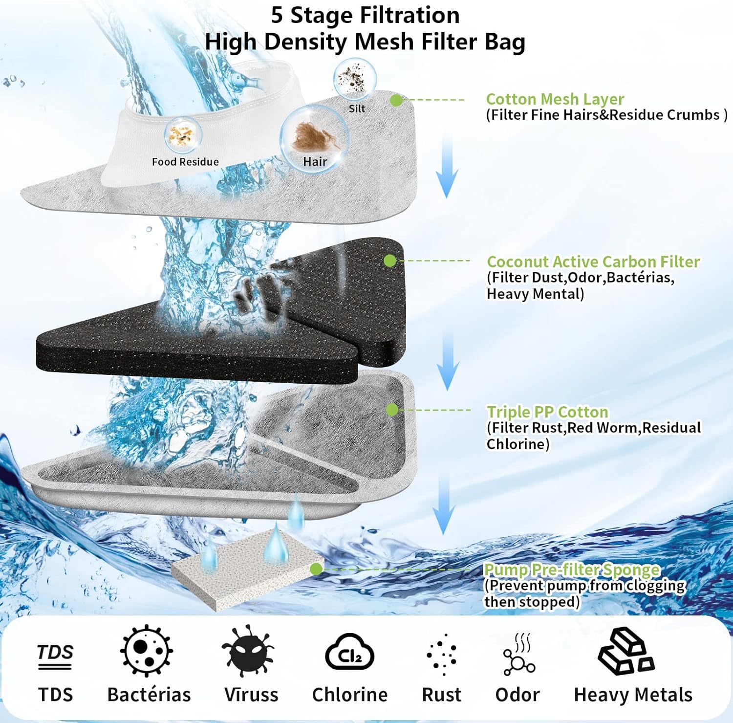 [Filtración de fuente de agua de 5 capas] Filtración de 3 capas de carbonos activados de coco absorben ordor. Con cuidado, agregamos un filtro de malla de algodón 6X y una esponja 6X para filtrar cada artículo grande, como pelo o restos de comida en caso de obstrucciones. Tu mascota siempre recibe agua fresca y limpia con nuestro filtro.