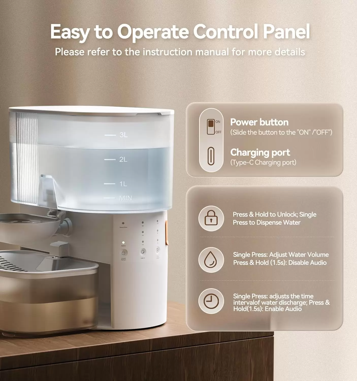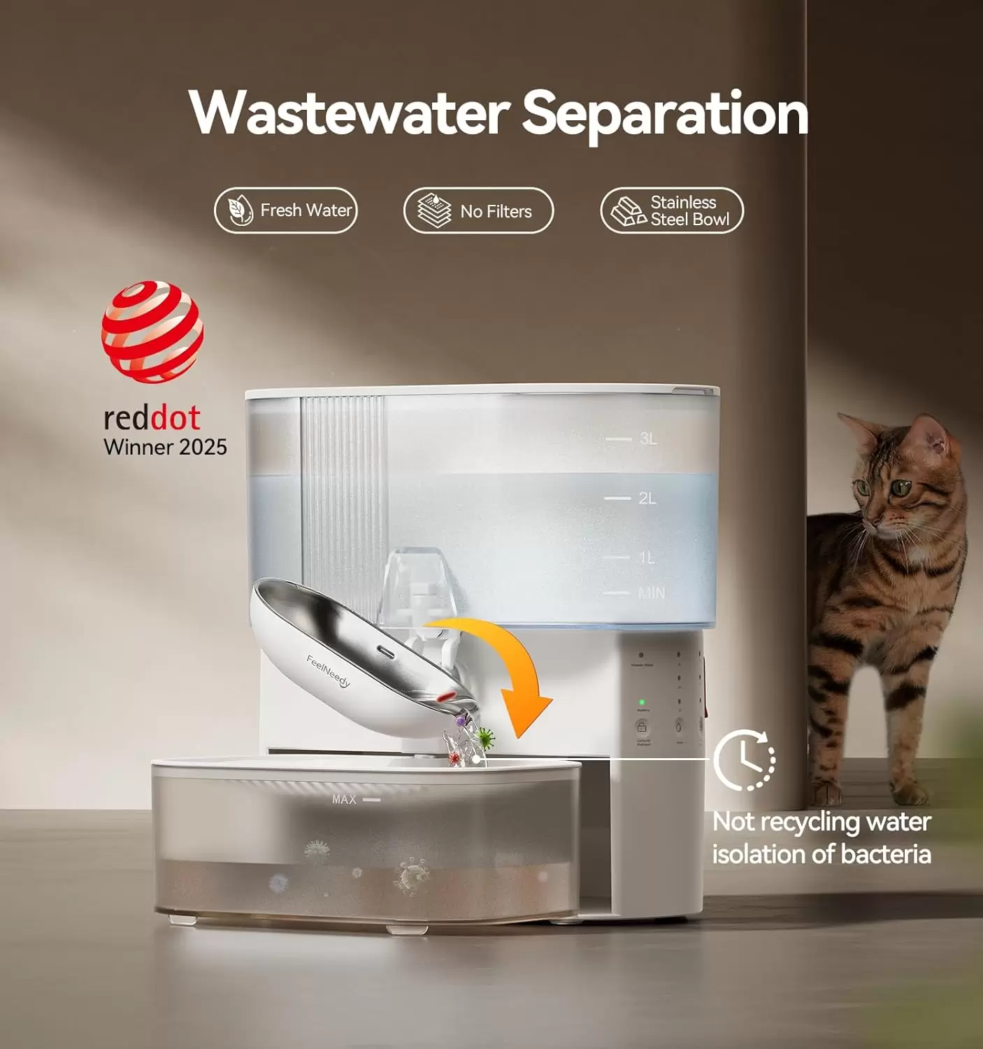 La primera fuente autolimpiable Sin Filtros. Separa el agua sucia de la limpia. Batería increíble de 180 días, plato de acero inoxidable y 3.5 Litros. Ahorra dinero y gana higiene.