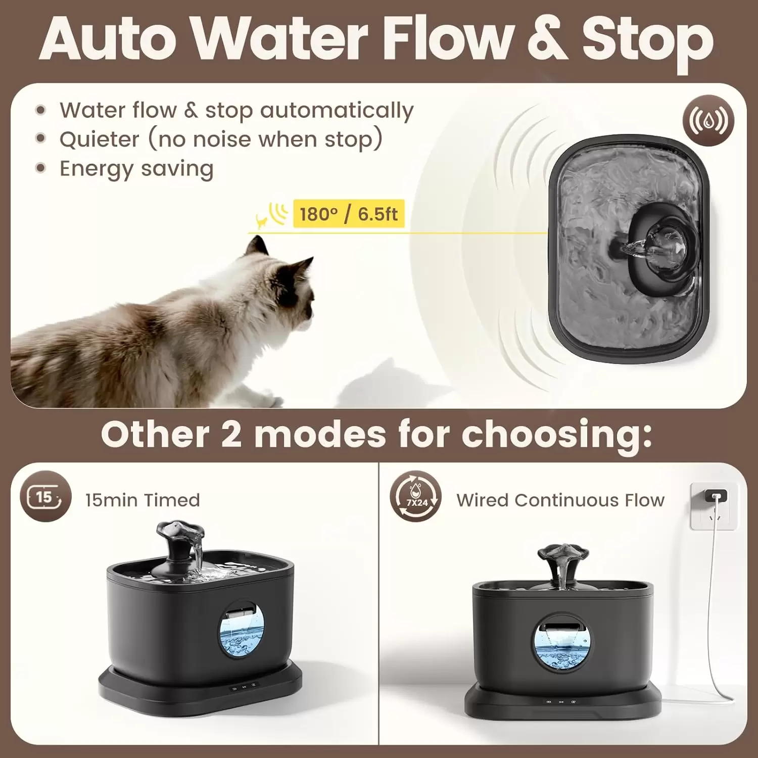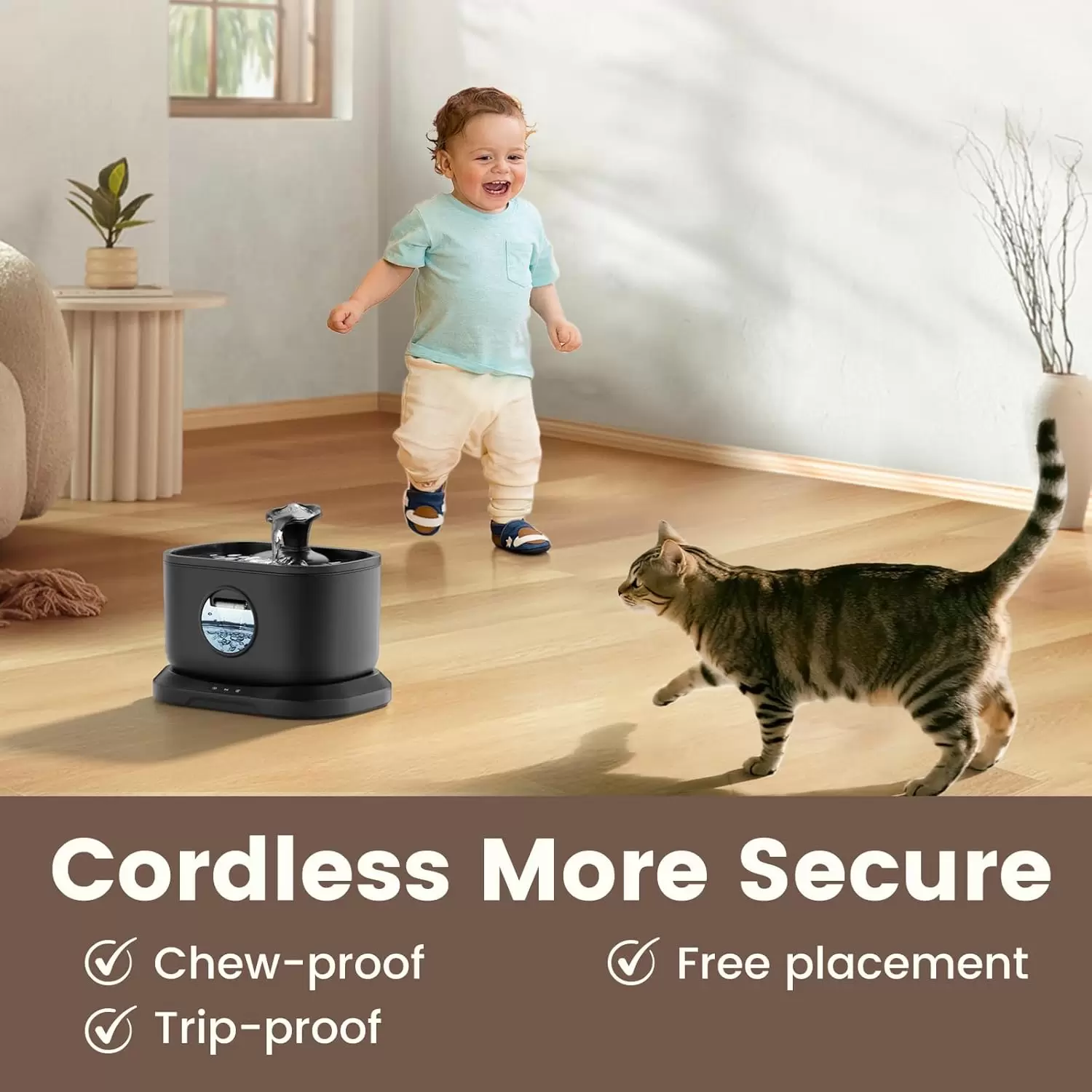 Fuente inalámbrica de 2.5L con sensor de radar preciso. Batería de 5000 mAh (30 días), bomba segura sin cables y 4 filtros incluidos. Tecnología avanzada para mascotas.
