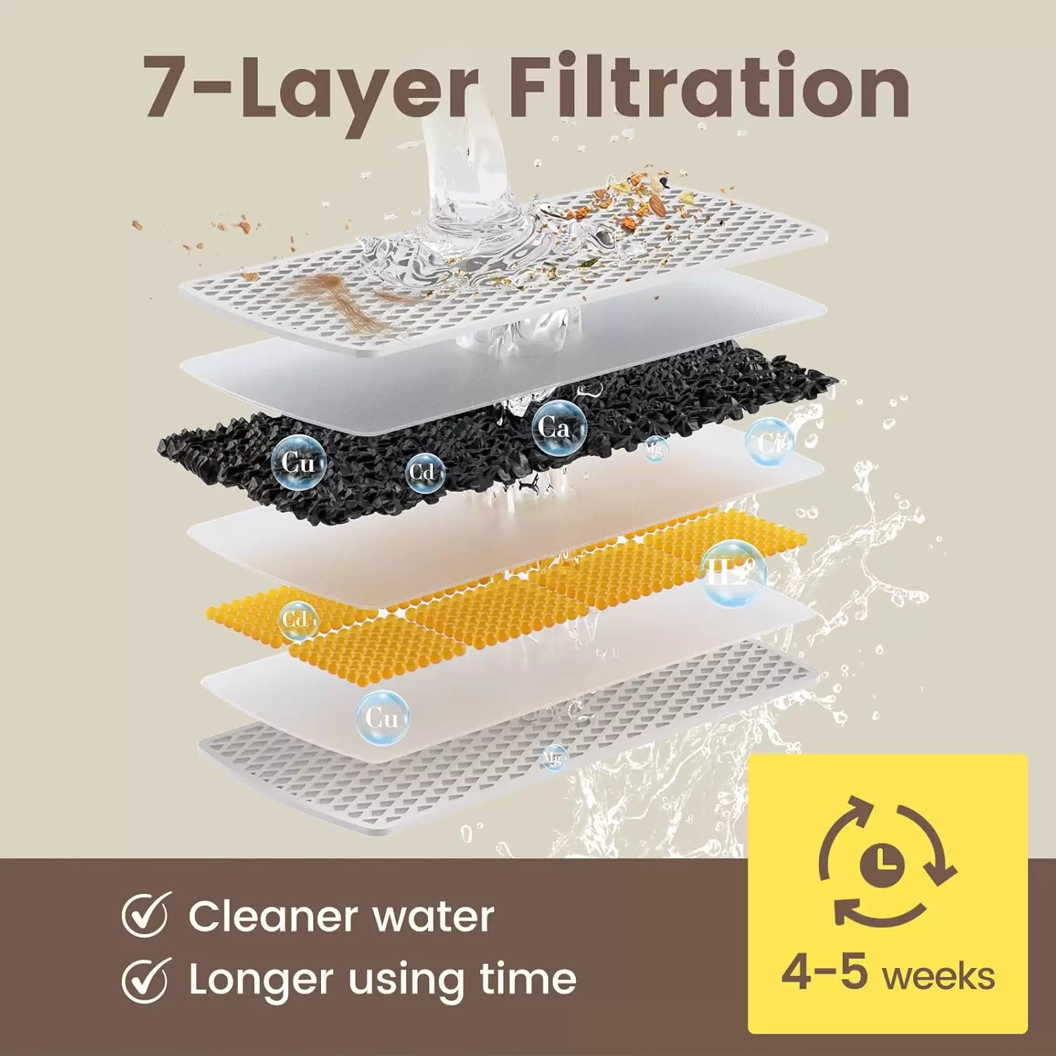 Con una batería gigante de 5000 mAh, esta fuente puede funcionar hasta 30 días con una sola carga. Es perfecta para colocarla en cualquier rincón de la casa, lejos de enchufes. Además, pensamos en tu bolsillo: el paquete incluye 4 filtros de 7 etapas, asegurando agua pura y cristalina por 5 meses sin que tengas que comprar repuestos.