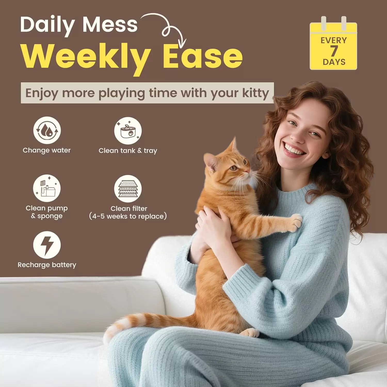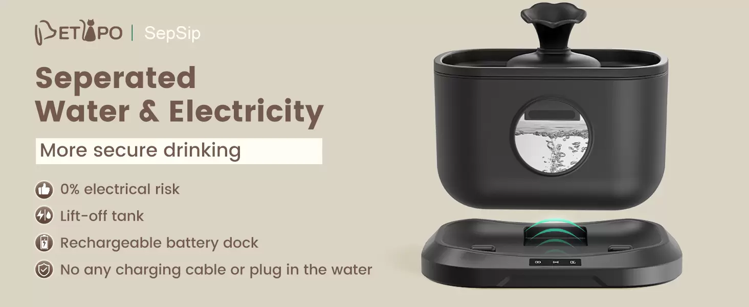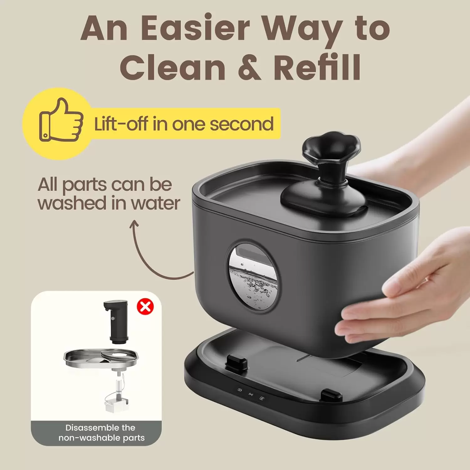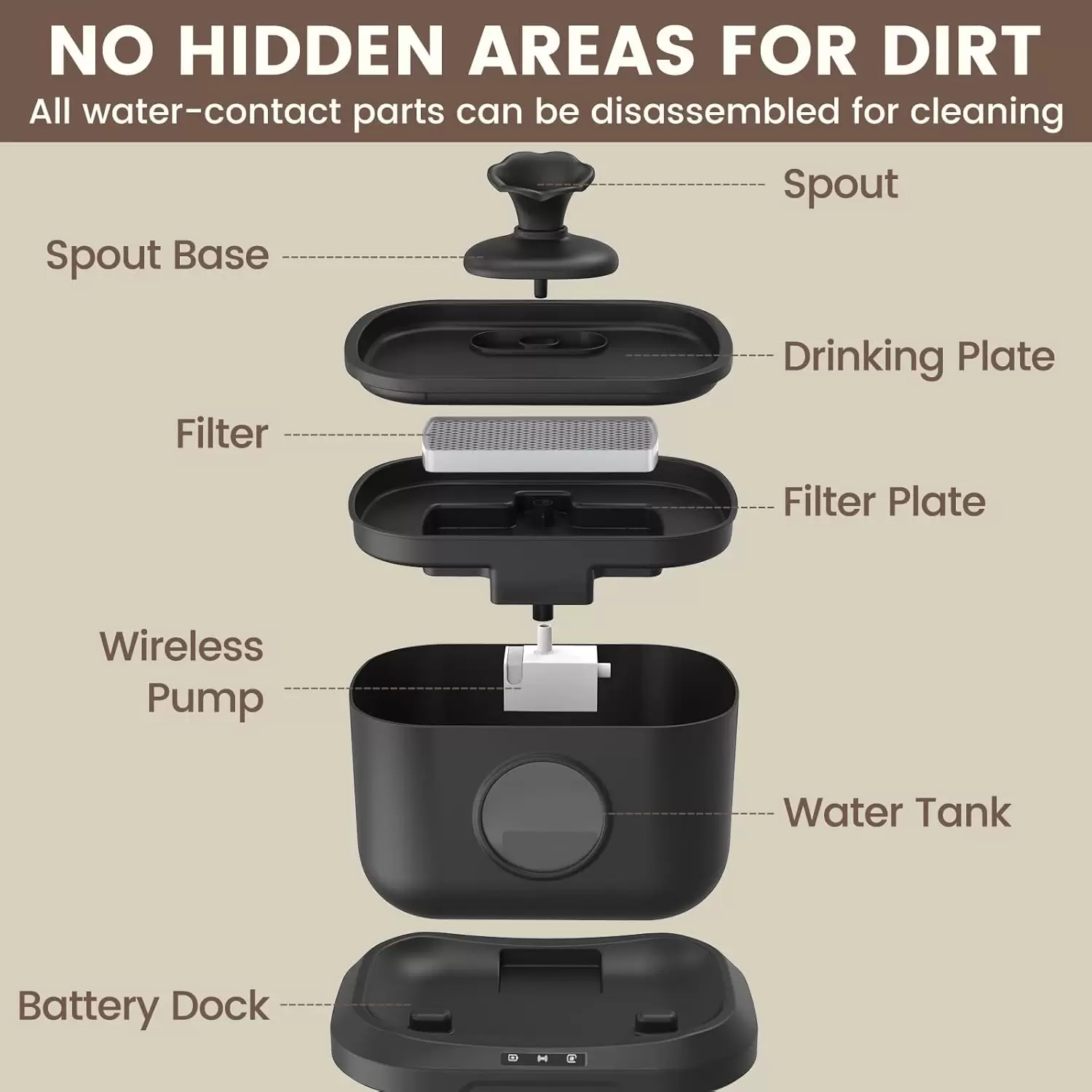 Su diseño es 100% inalámbrico y seguro: no hay cables dentro del agua ni expuestos, eliminando cualquier riesgo de fugas eléctricas o de que tus gatos muerdan los cables. La bomba funciona por inducción, separando totalmente la electricidad del agua.