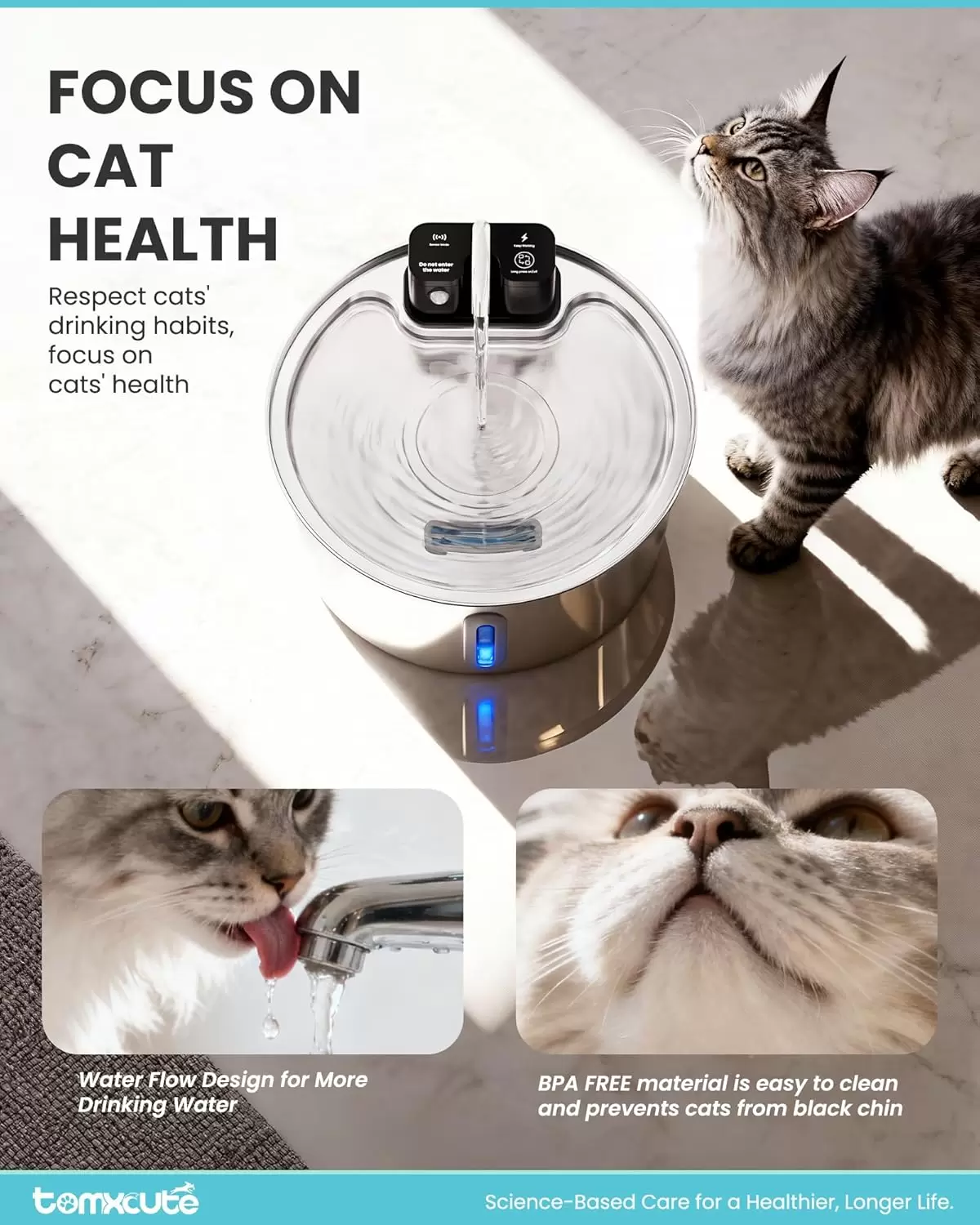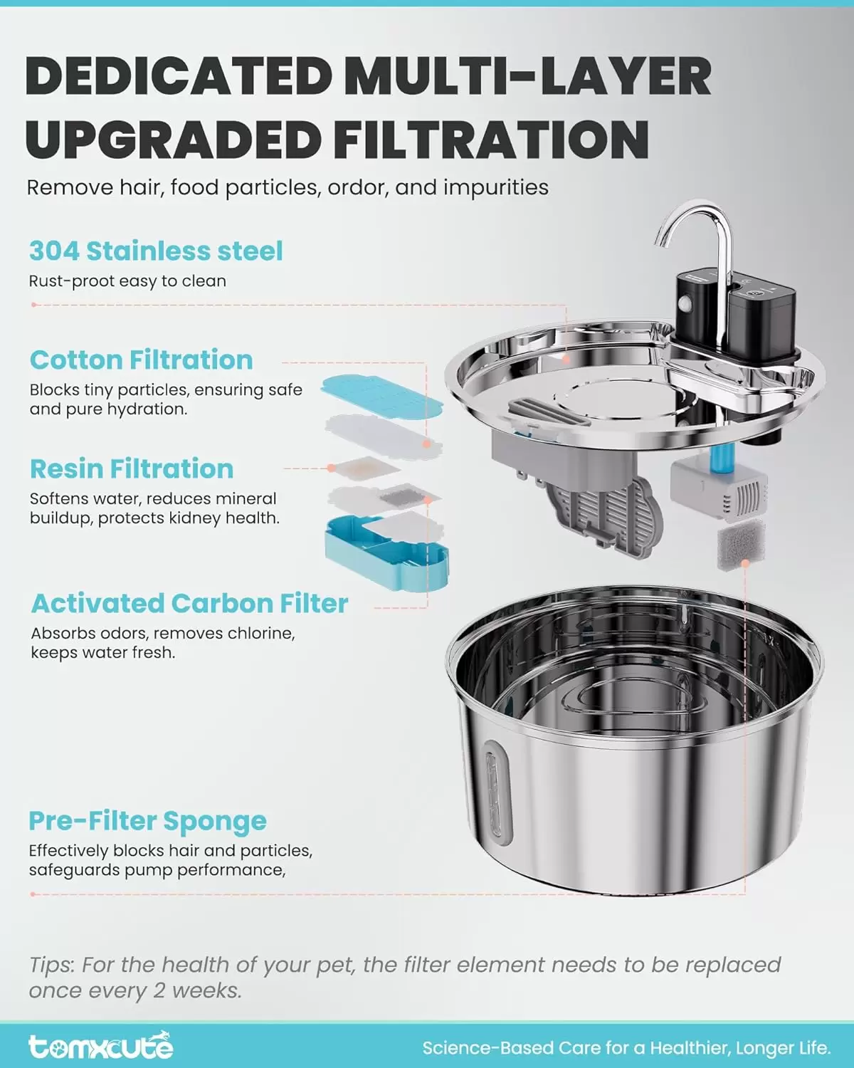 Tecnología que cuida su salud y tu tranquilidad El plato de acero inoxidable garantiza que tu mascota beba sobre una superficie limpia y libre de bacterias, previniendo el acné felino. Su sensor inteligente no solo ahorra batería, sino que despierta el instinto natural de beber al activar el flujo de agua cuando ellos se acercan. Además, la ventana transparente te permite revisar el nivel de los 3.2 litros de un vistazo, asegurando que tus regalones siempre tengan su hidratación al día.