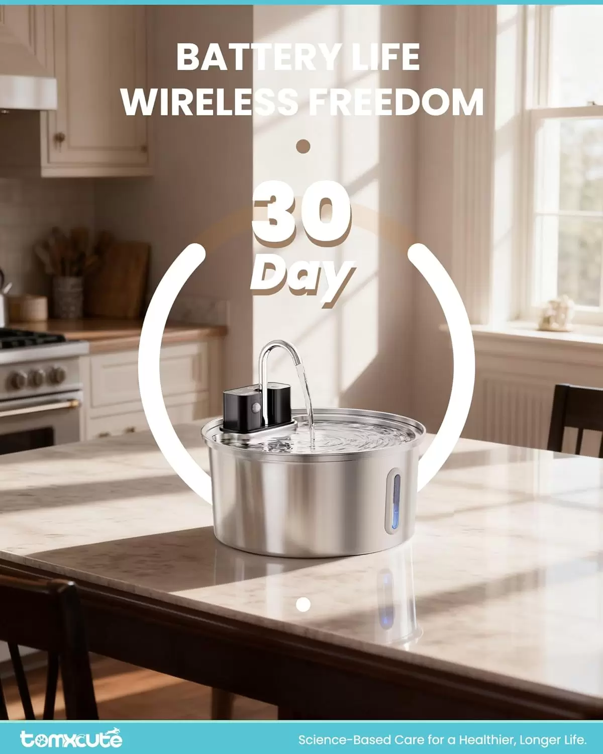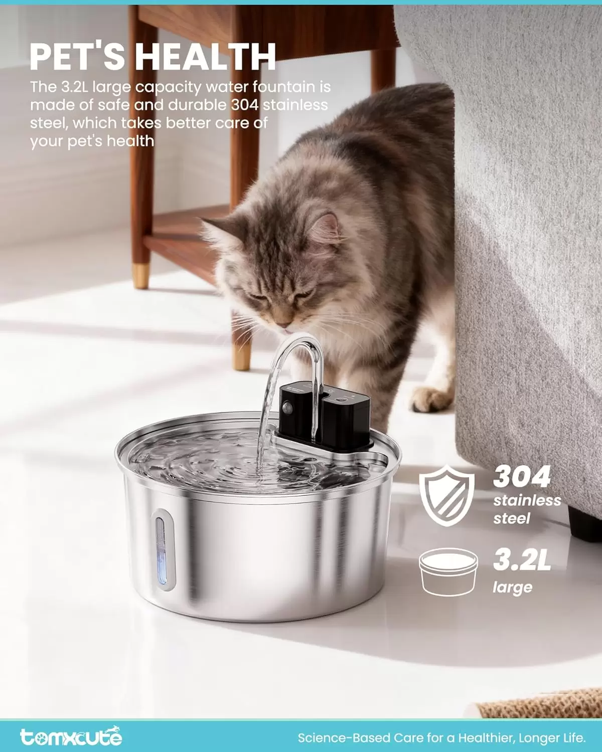 Capacidad Optimizada: Tanque de 3.2 Litros que ofrece el equilibrio perfecto: compacto para interiores pero con volumen suficiente para hidratar a un gato por 2 semanas o un perro pequeño por 1 semana.