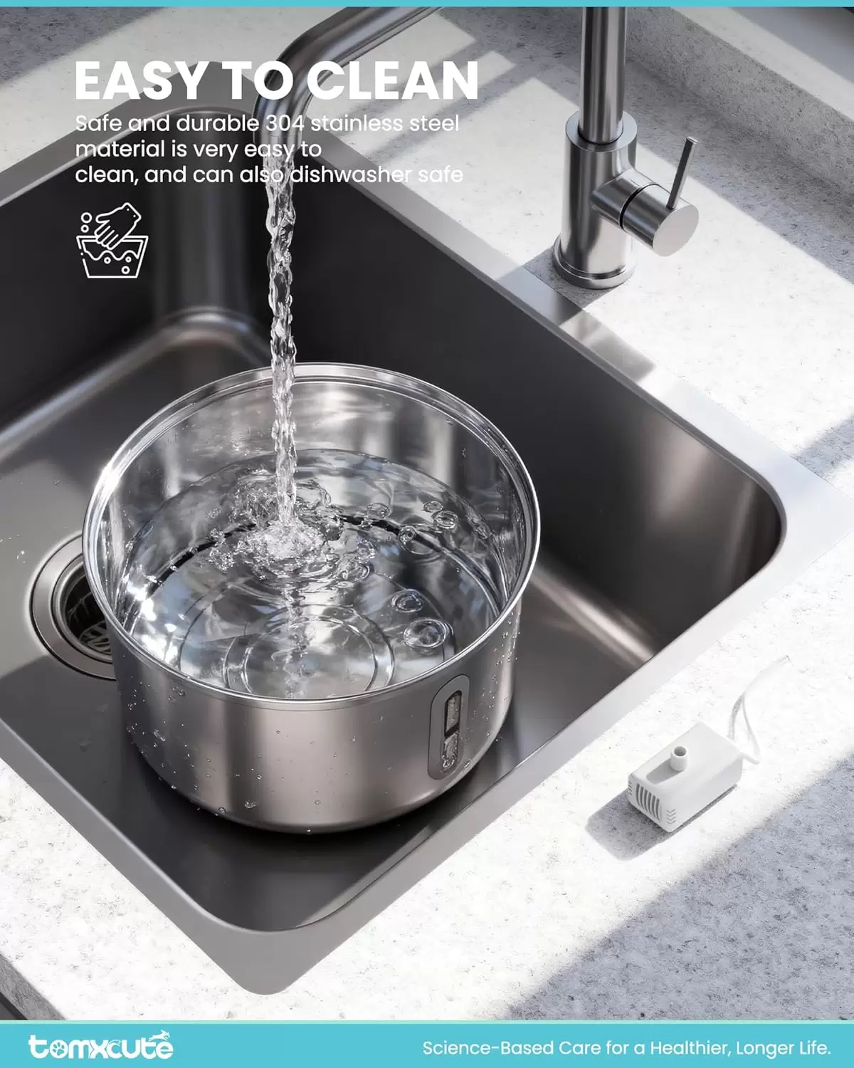 Higiene Híbrida: Cuenco de agua de Acero Inoxidable 304 (donde bebe la mascota) para máxima higiene, combinado con cuerpo de resina ABS duradera.