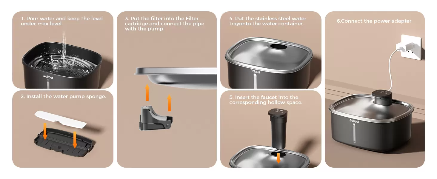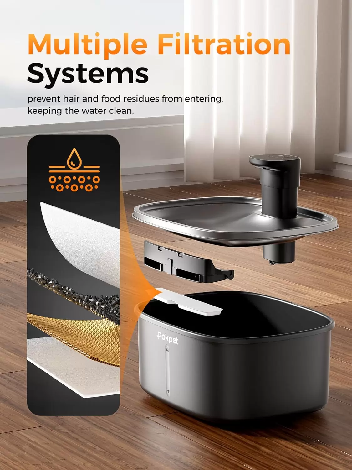 El agua se mantiene siempre limpia gracias a un sistema de filtración multicapa que elimina metales pesados, suciedad y pelos, asegurando una hidratación saludable en cada sorbo.