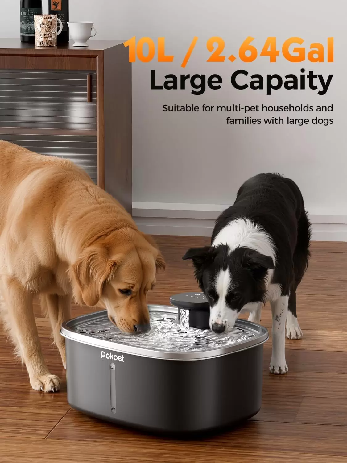 Olvídate de rellenar el bebedero constantemente. Con una capacidad masiva de 10 Litros (2.64 galones), esta fuente está diseñada para satisfacer las necesidades de hidratación de perros de razas grandes o de hogares con múltiples gatos y perros durante días. Su construcción en Acero Inoxidable de alta calidad no solo es higiénica y resistente al óxido, sino que también ofrece un diseño robusto y a prueba de vuelcos, ideal para mascotas con mucha energía. Su cuenco profundo evita salpicaduras y permite beber cómodamente.